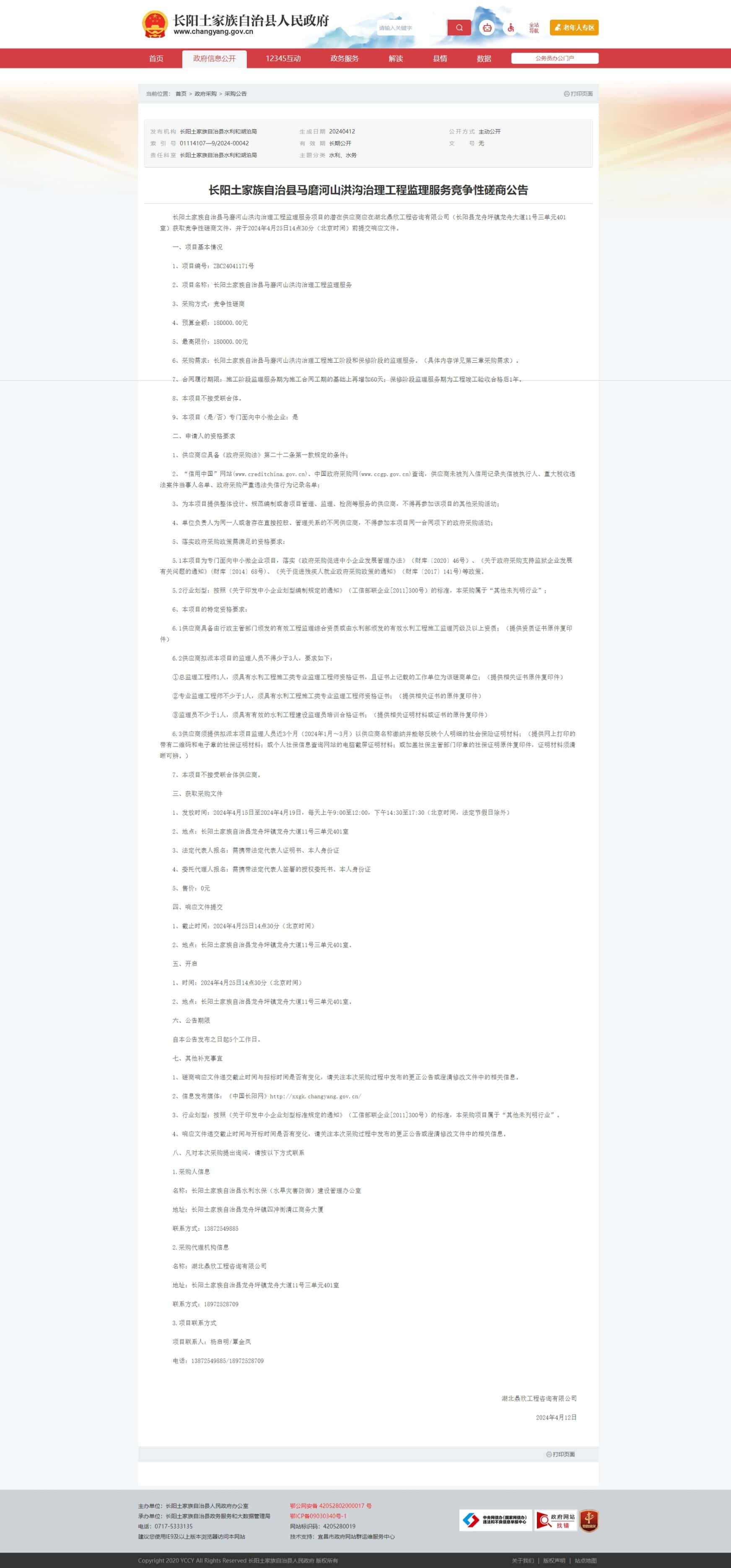 长阳土家族自治县马磨河山洪沟治理工程监理服务竞争性磋商公告