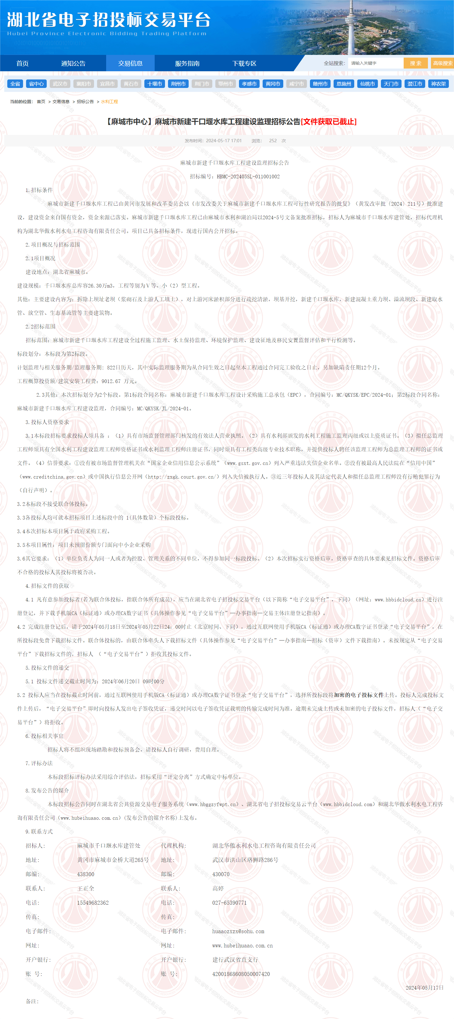8.发布公告的媒介 本标段招标公告同时在湖北省公共资源交易电子服务系统(www.hbggzyfwpt.cn)、湖北省电子招投标交易云平台(www.hbbidcloud.com)和湖北华傲水利水电工程咨询有限责任公司(www.hubeihuaao.com.cn)(发布公告的媒介名称)上发布。9.联系方式招标人:麻城市千口堰水库建管处代理机构:湖北华傲水利水电工程咨询有限责任公司