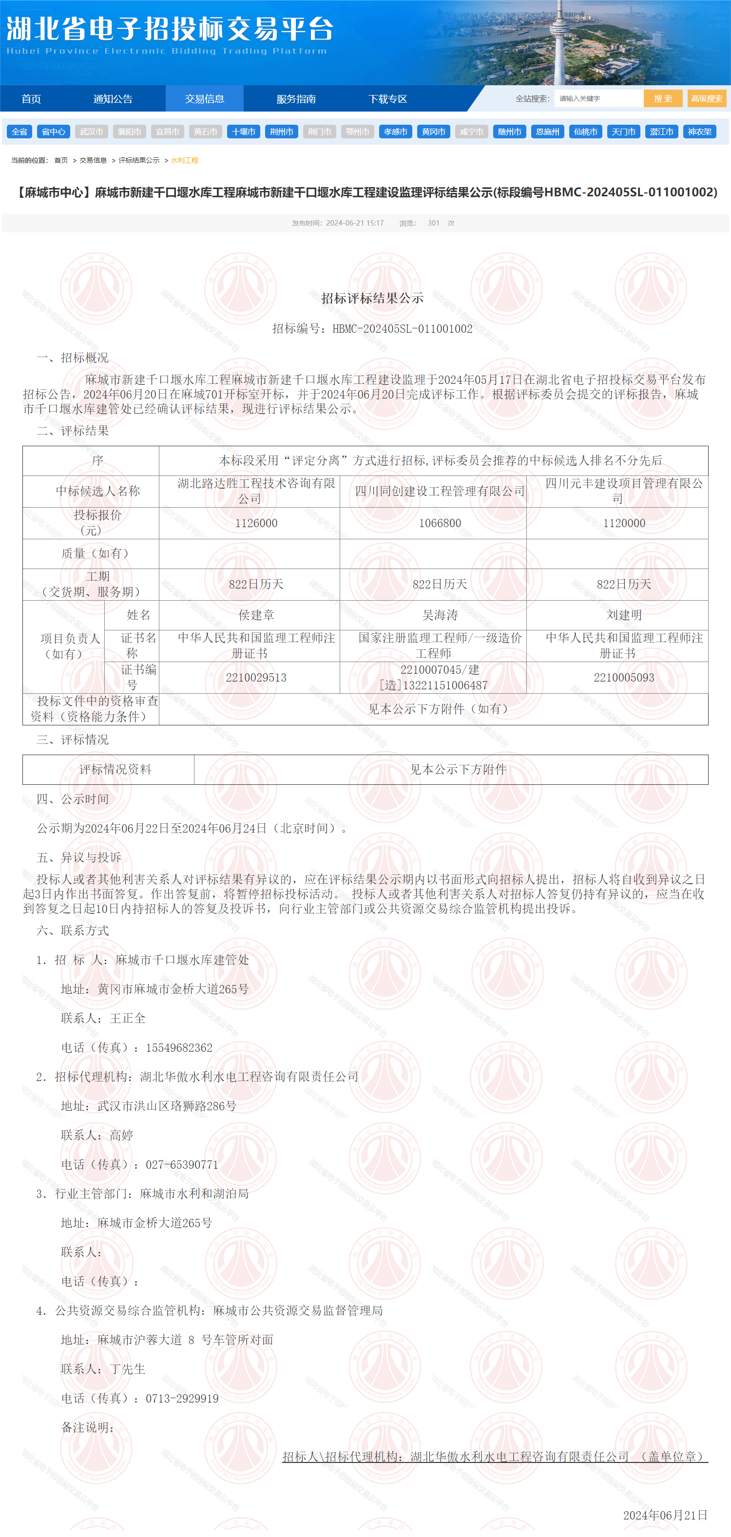 麻城市新建千口堰水库工程麻城市新建千口堰水库工程建设监理于2024年05月17日在湖北省电子招投标交易平台发布招标公告,2024年06月20日在麻城701开标室开标,并于2024年06月20日完成评标工作。根据评标委员会提交的评标报告,麻城市千口堰水库建管处已经确认评标结果,现进行评标结果公示。
