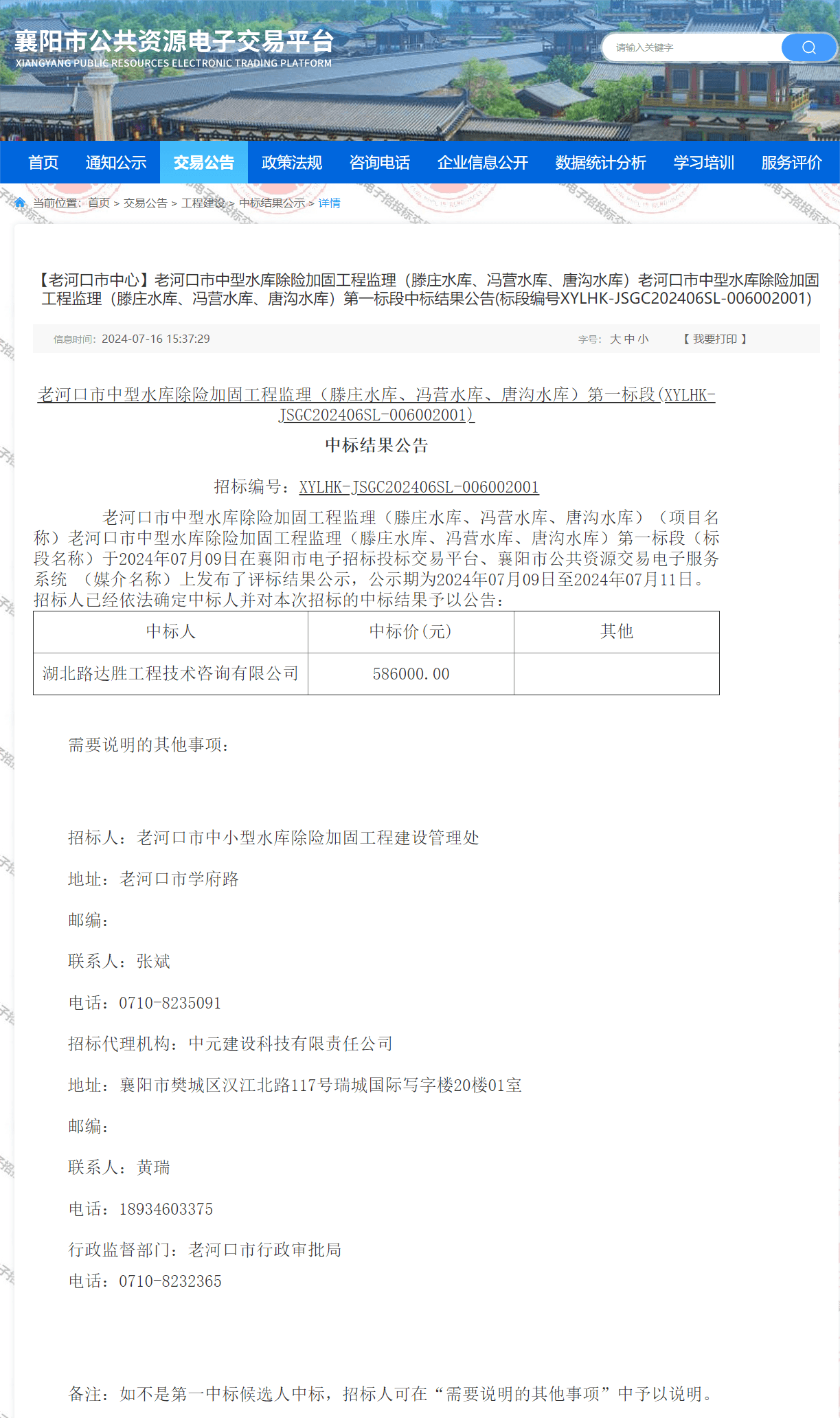 老河口市中型水库除险加固工程监理(滕庄水库、冯营水库、唐沟水库)(项目名称)老河口市中型水库除险加固工程监理(滕庄水库、冯营水库、唐沟水库)第一标段(标段名称)于2024年07月09日在襄阳市电子招标投标交易平台、襄阳市公共资源交易电子服务系统 (媒介名称)上发布了评标结果公示,公示期为2024年07月09日至2024年07月11日。招标人已经依法确定中标人并对本次招标的中标结果予以公告: