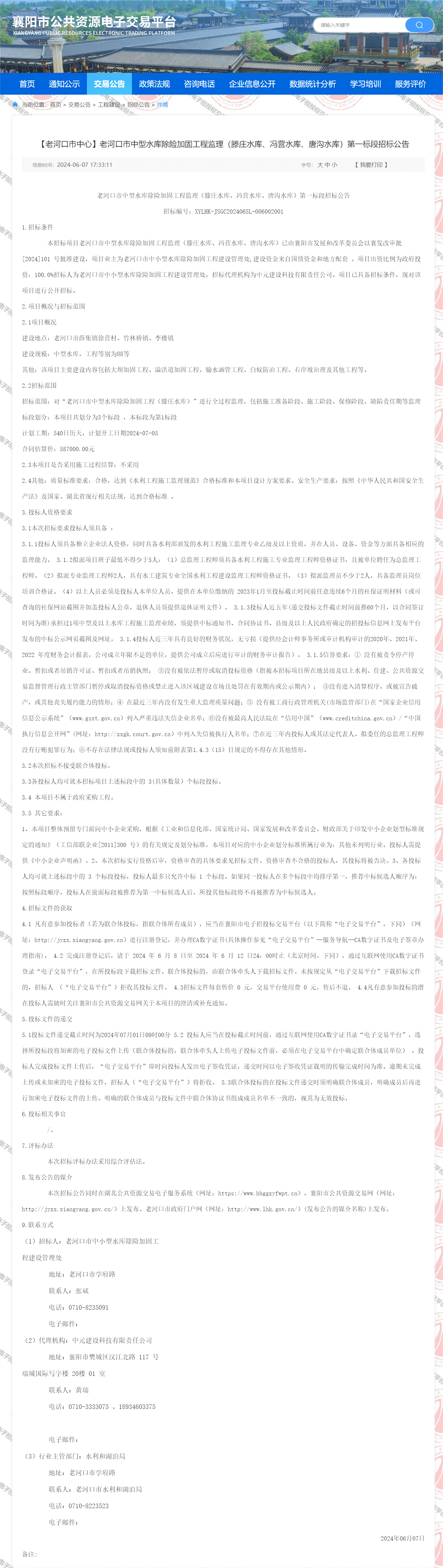 老河口市中型水库除险加固工程监理(滕庄水库、冯营水库、唐沟水库)第一标段招标公告