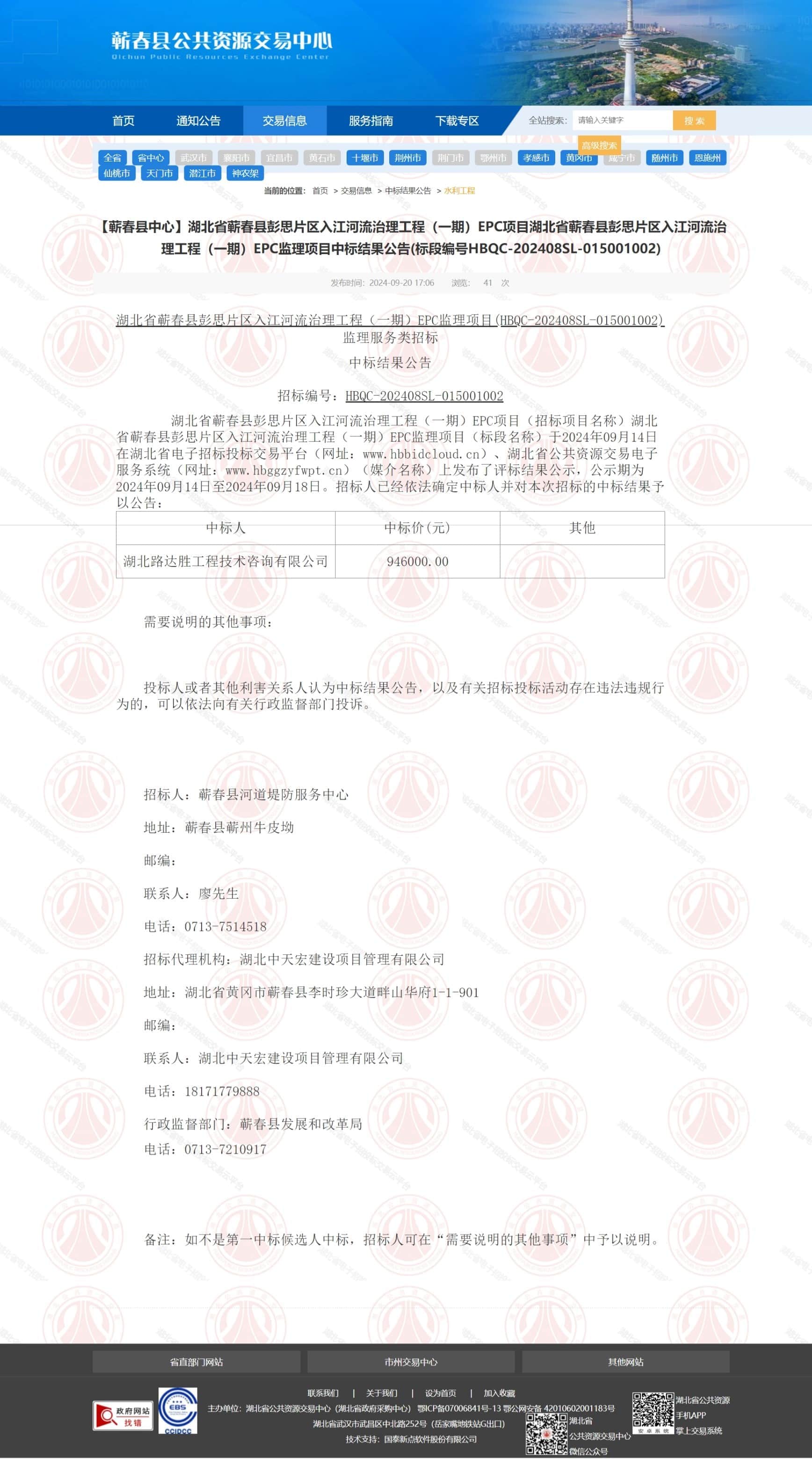 【蕲春县中心】湖北省蕲春县彭思片区入江河流治理工程(一期)EPC项目湖北省蕲春县彭思片区入江河流治理工程(一期)EPC监理项目中标结果公告(标段编号HBQC-202408SL-015001002)