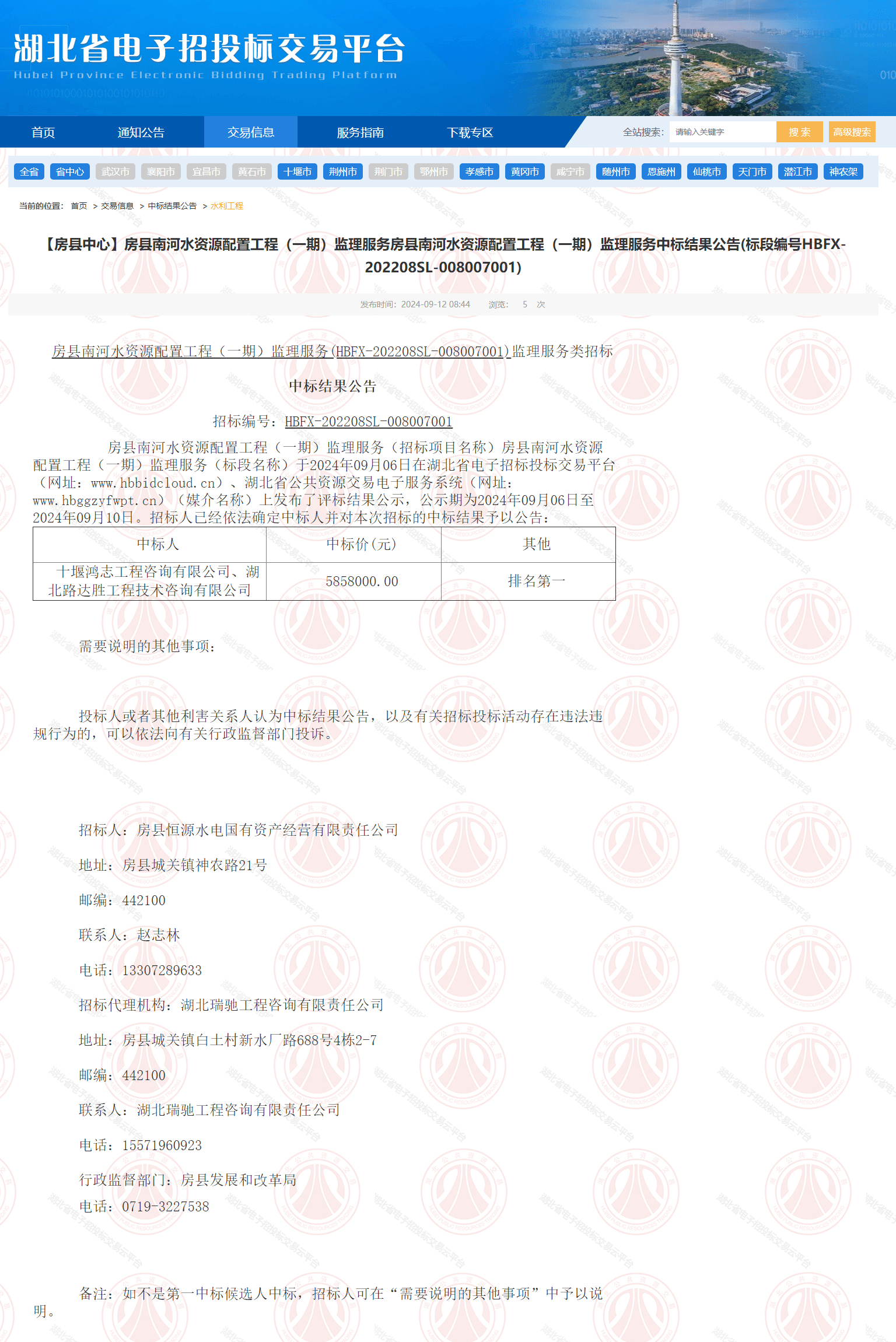 房县南河水资源配置工程(一期)监理服务(招标项目名称)房县南河水资源配置工程(一期)监理服务(标段名称)于2024年09月06日在湖北省电子招标投标交易平台(网址:www.hbbidcloud.cn)、湖北省公共资源交易电子服务系统(网址:www.hbggzyfwpt.cn)(媒介名称)上发布了评标结果公示,公示期为2024年09月06日至2024年09月10日。招标人已经依法确定中标人并对本次招标的中标结果予以公告: