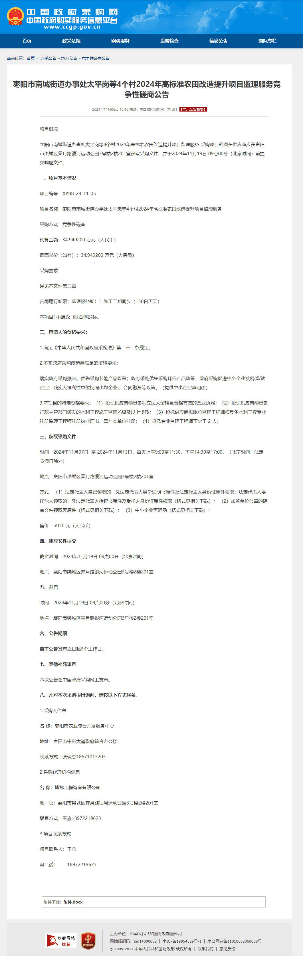 枣阳市南城街道办事处太平岗等4个村2024年高标准农田改造提升项目监理服务 采购项目的潜在供应商应在襄阳市樊城区霁月路银河运动公园3号楼2楼201室获取采购文件,并于2024年11月19日 09点00分(北京时间)前提交响应文件。