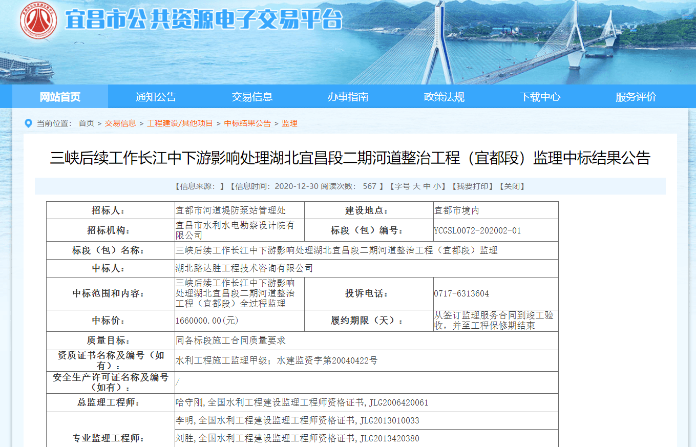 三峡后续工作长江中下游影响处理湖北宜昌段二期河道整治工程(宜都段)监理中标结果公告