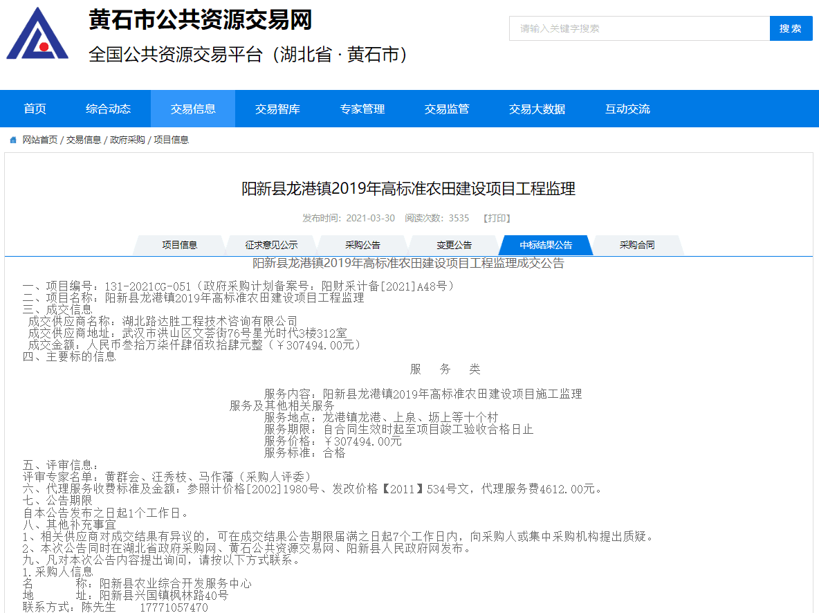 阳新县龙港镇2019年高标准农田建设项目工程监理成交公告