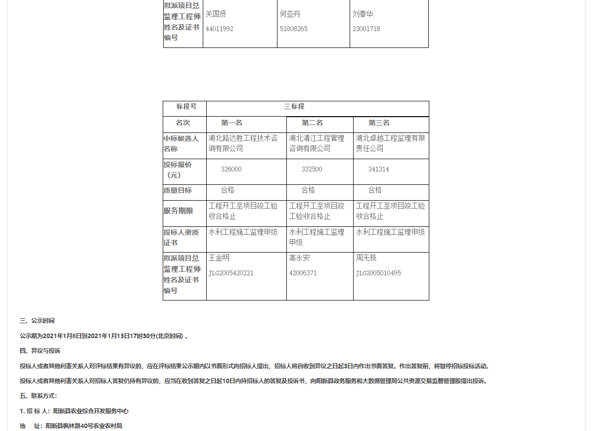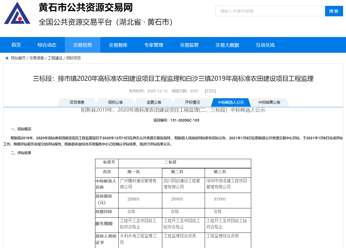 阳新县2019年、2020年高标准农田建设项目工程监理(二、三标段)中标候选人公示