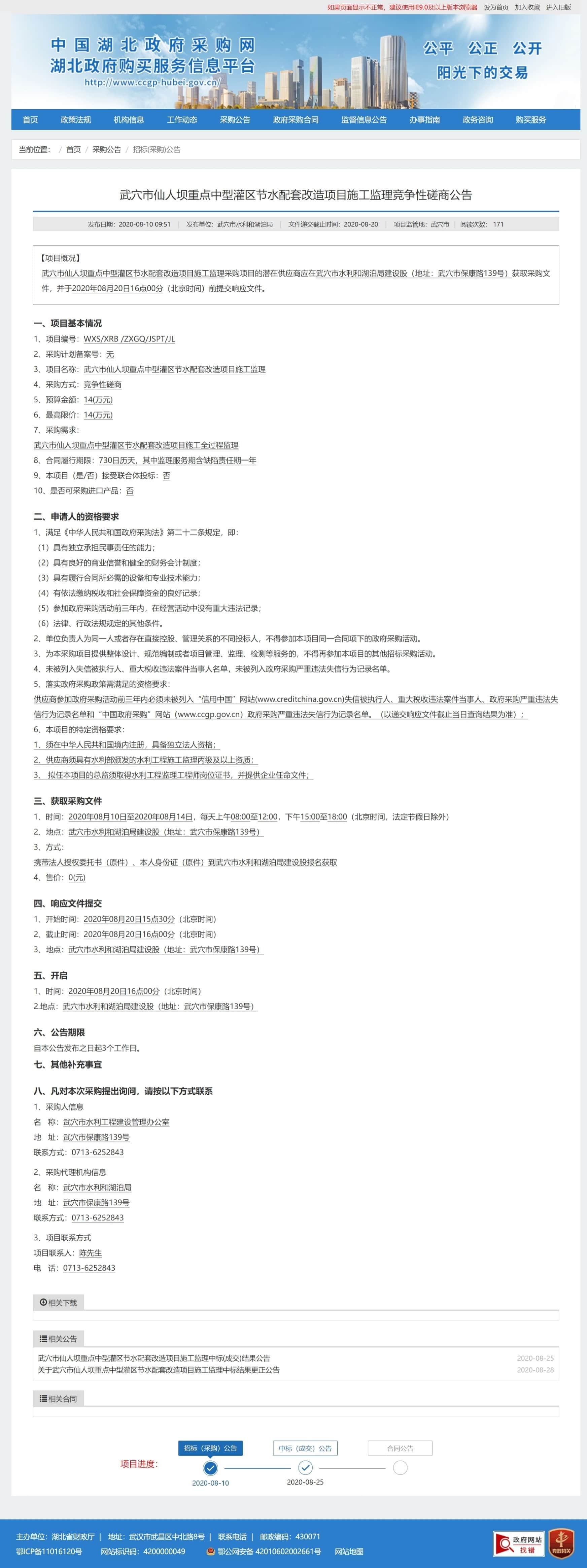 武穴市仙人坝重点中型灌区节水配套改造项目施工监理采购项目的潜在供应商应在武穴市水利和湖泊局建设股(地址:武穴市保康路139号)获取采购文件,并于2020年08月20日16点00分(北京时间)前提交响应文件。