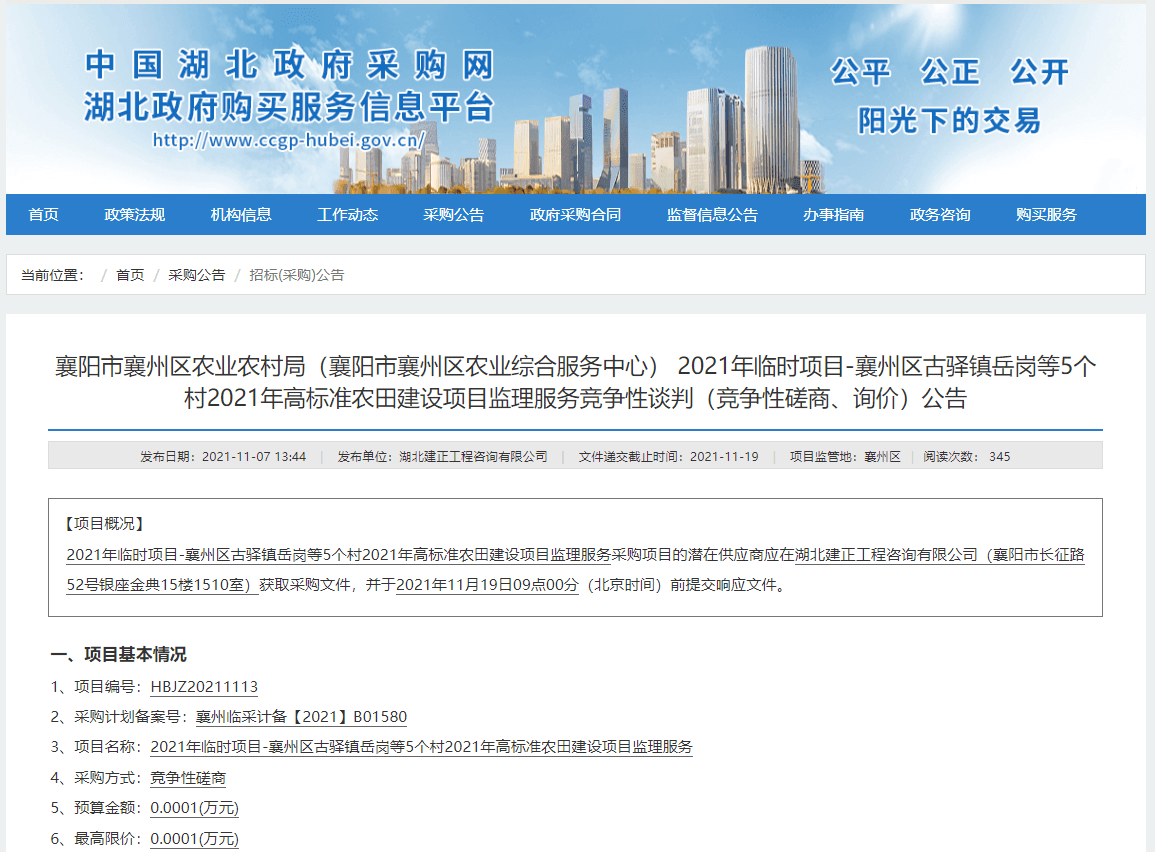 3、项目名称:2021年临时项目-襄州区古驿镇岳岗等5个村2021年高标准农田建设项目监理服务
