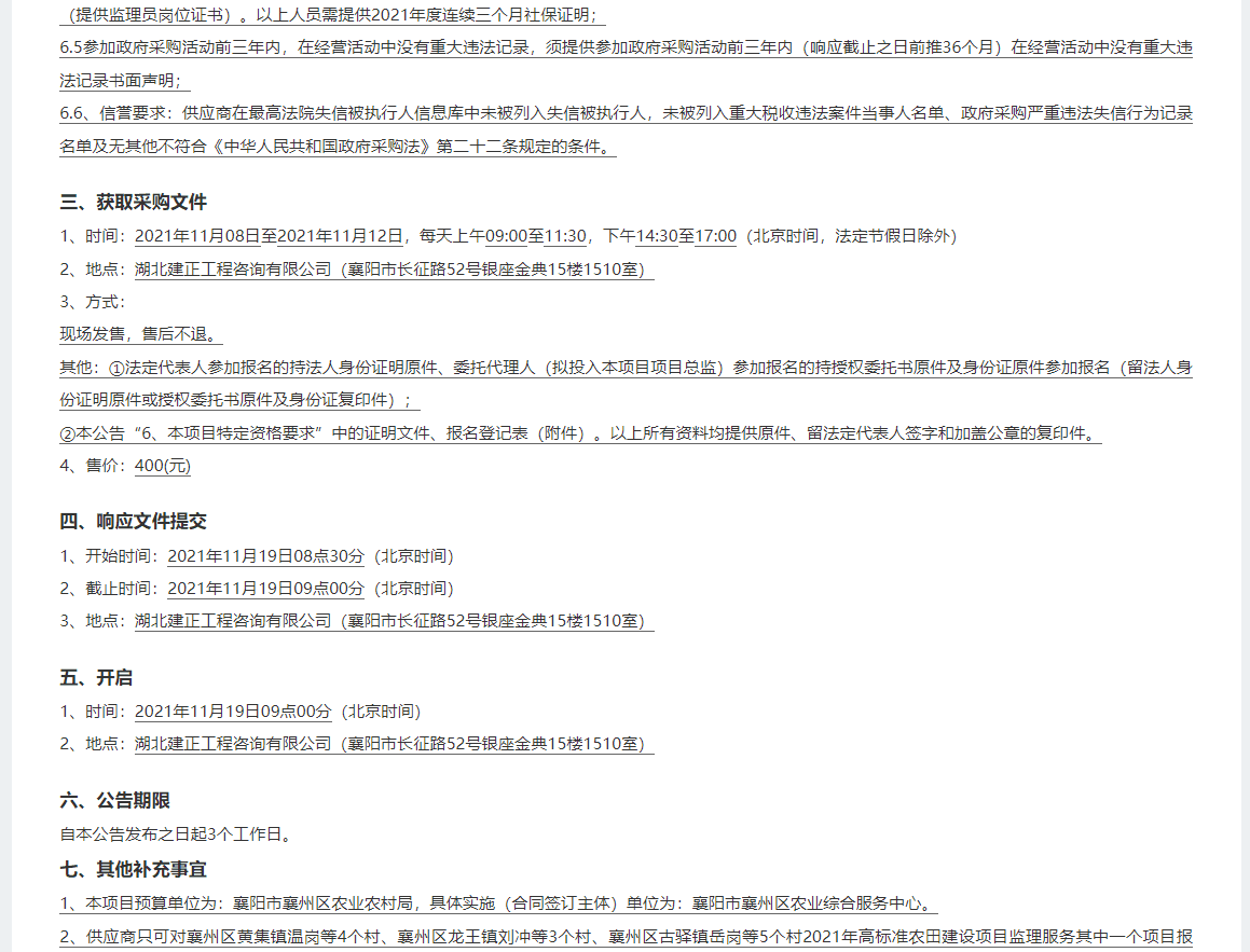 2021年临时项目-襄州区古驿镇岳岗等5个村2021年高标准农田建设项目监理服务采购项目的潜在供应商应在湖北建正工程咨询有限公司(襄阳市长征路52号银座金典15楼1510室)获取采购文件,并于2021年11月19日09点00分(北京时间)前提交响应文件。
