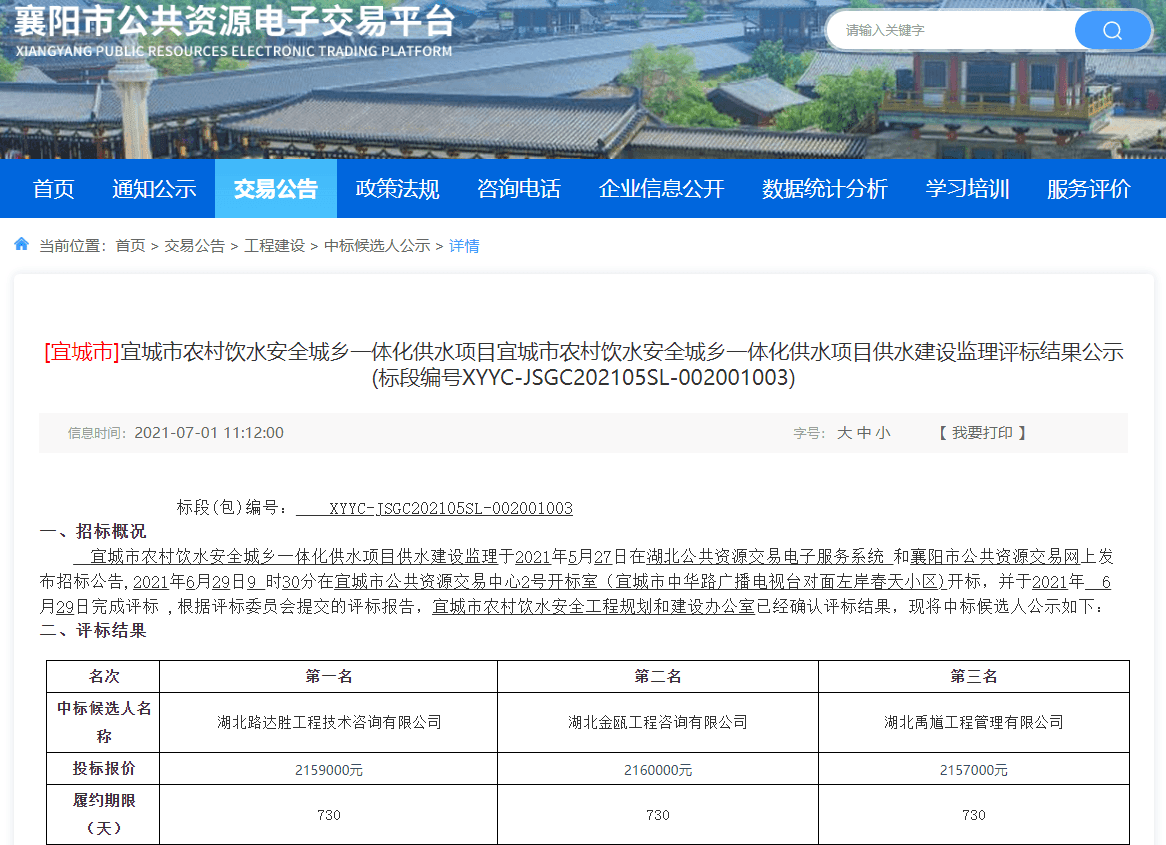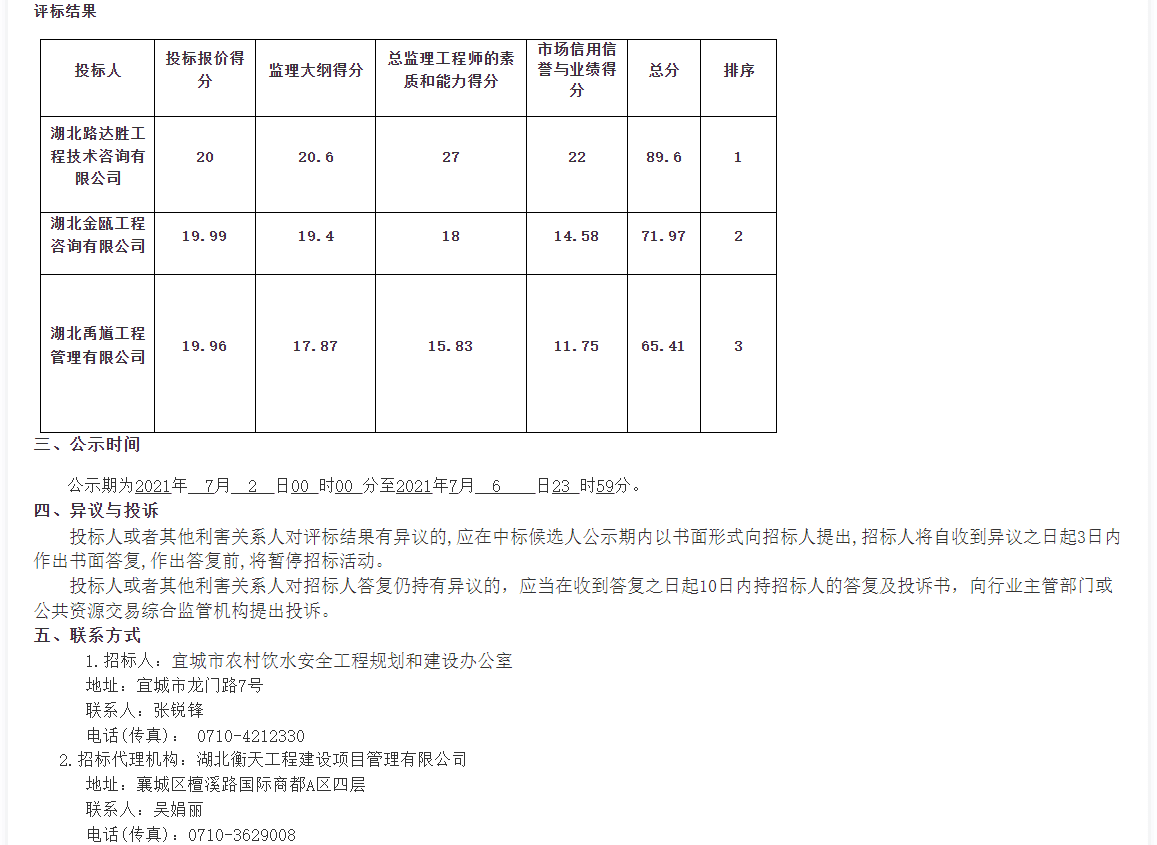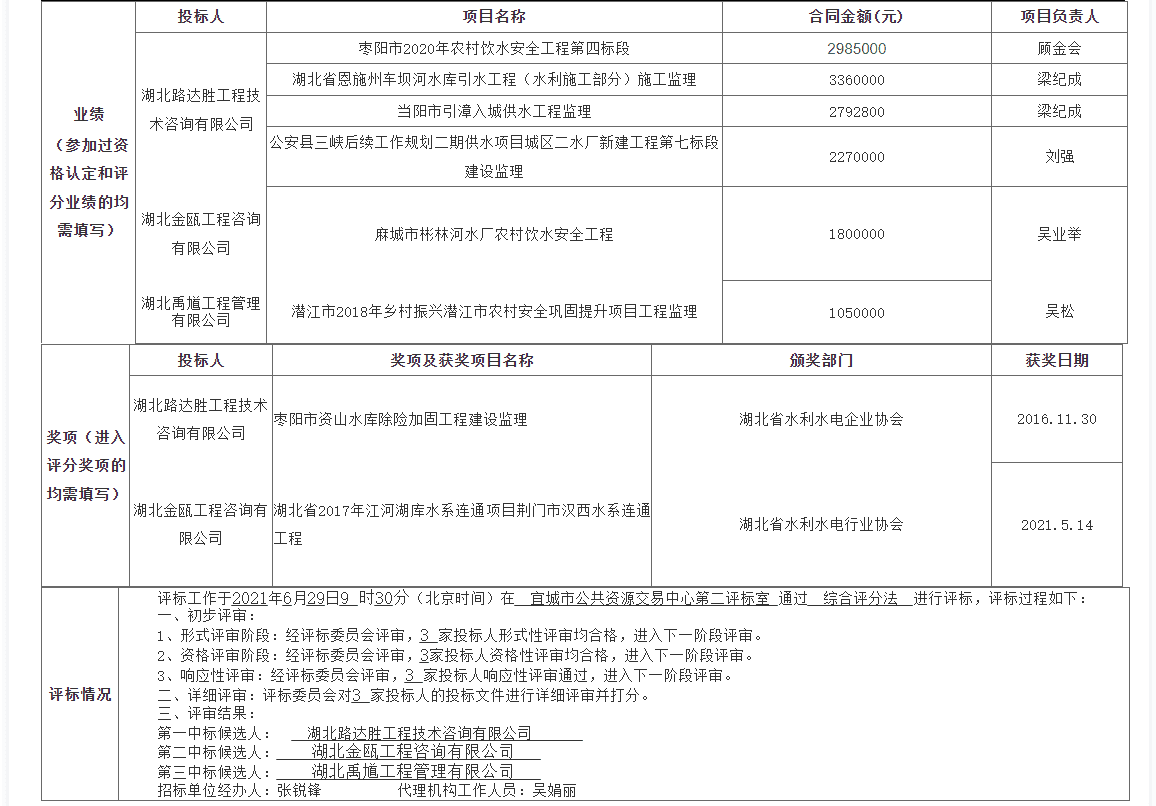 宜城市农村饮水安全城乡一体化供水项目供水建设监理2021527日在湖北公共资源交易电子服务系统 襄阳市公共资源交易网上发布招标公告,202162930分在宜城市公共资源交易中心2号开标室(宜城市中华路广播电视台对面左岸春天小区)开标,并于2021 629日完成评标 ,根据评标委员会提交的评标报告,宜城市农村饮水安全工程规划和建设办公室已经确认评标结果,现将中标候选人公示如下: