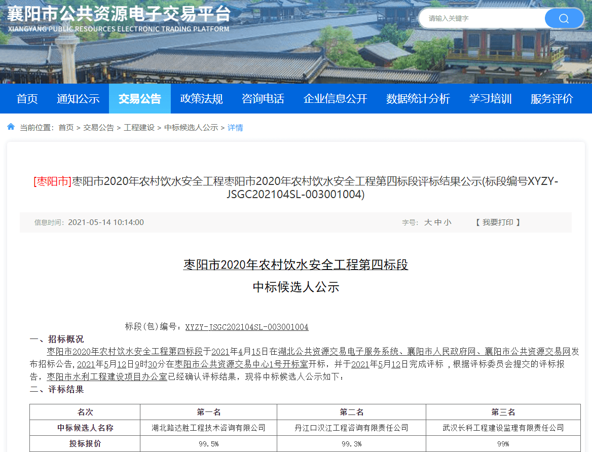 枣阳市2020年农村饮水安全工程第四标段2021415日在湖北公共资源交易电子服务系统、襄阳市人民政府网、襄阳市公共资源交易网发布招标公告,2021512930分在枣阳市公共资源交易中心1号开标室开标,并于2021512日完成评标 ,根据评标委员会提交的评标报告,枣阳市水利工程建设项目办公室已经确认评标结果,现将中标候选人公示如下: