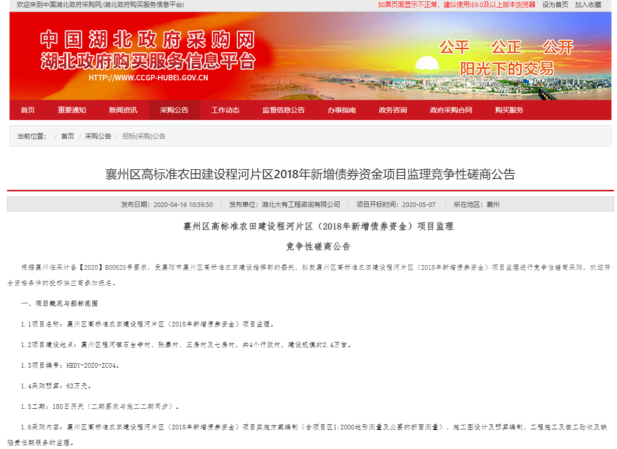 根据襄州临采计备【2020】B00625号要求,受襄阳市襄州区高标准农田建设指挥部的委托,拟就襄州区高标准农田建设程河片区(2018年新增债券资金)项目监理进行竞争性磋商采购,欢迎符合资格条件的投标供应商参加报名。