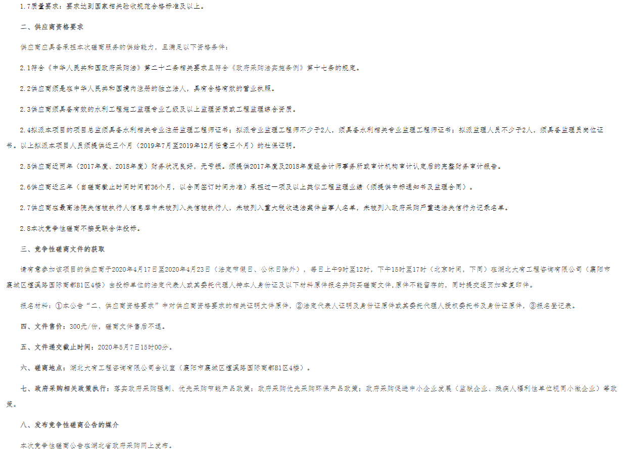 2.3供应商须具备有效的水利工程施工监理专业乙级及以上监理资质或工程监理综合资质。