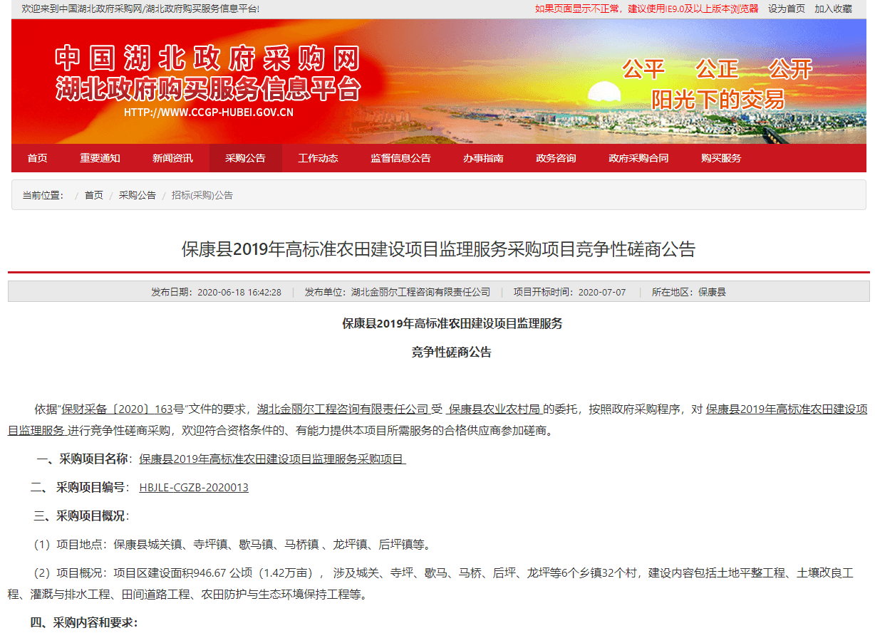 保康县2019年高标准农田建设项目监理服务采购项目竞争性磋商公告
