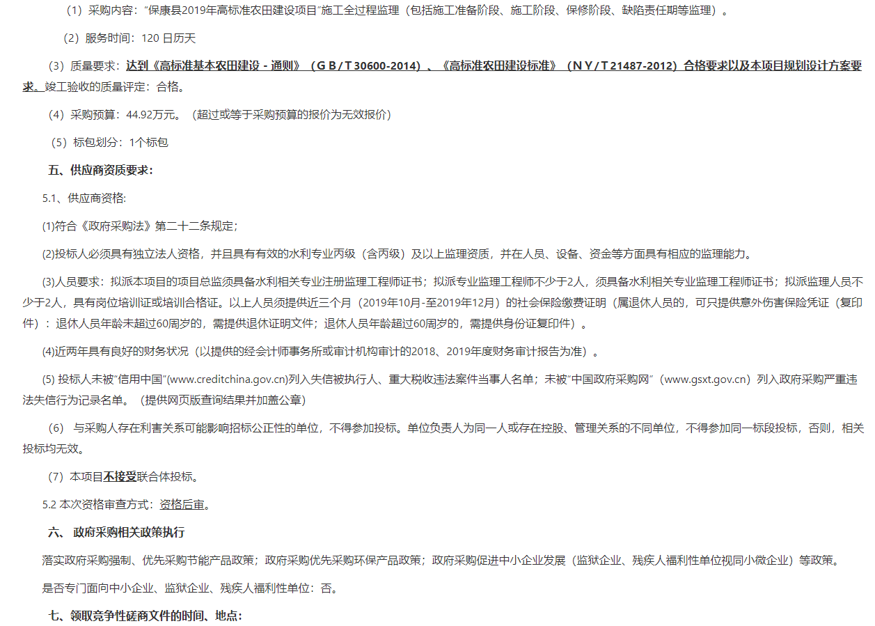 (1)采购内容:“保康县2019年高标准农田建设项目”施工全过程监理(包括施工准备阶段、施工阶段、保修阶段、缺陷责任期等监理)。