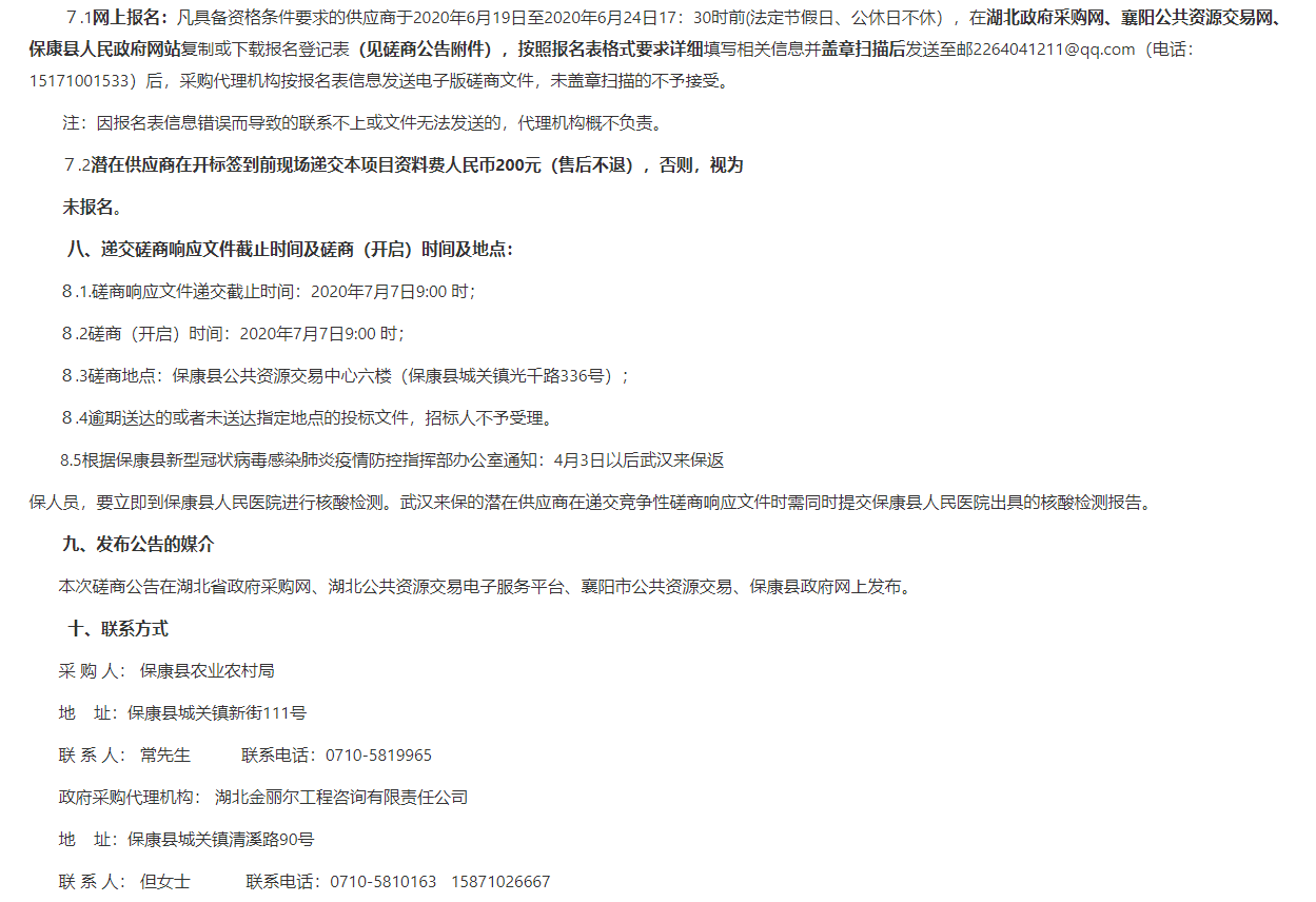 7.1网上报名:凡具备资格条件要求的供应商于2020年6月19日至2020年6月24日17:30时前(法定节假日、公休日不休),在湖北政府采购网、襄阳公共资源交易网、保康县人民政府网站复制或下载报名登记表(见磋商公告附件),按照报名表格式要求详细填写相关信息并盖章扫描后发送至邮2264041211@qq.com(电话:15171001533)后,采购代理机构按报名表信息发送电子版磋商文件,未盖章扫描的不予接受。