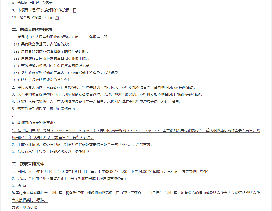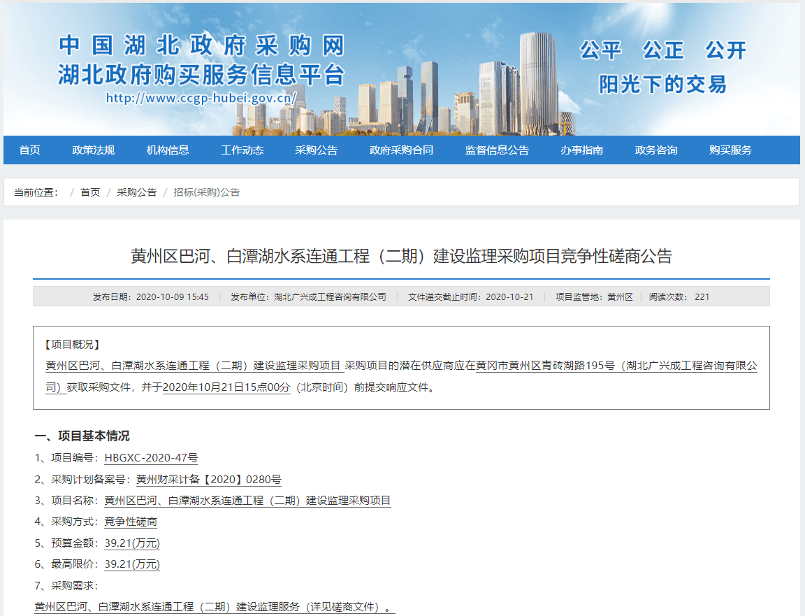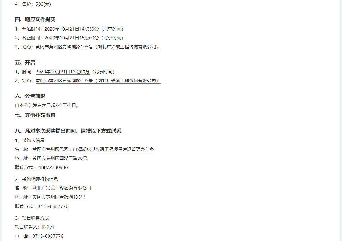 黄州区巴河、白潭湖水系连通工程(二期)建设监理采购项目 采购项目的潜在供应商应在黄冈市黄州区青砖湖路195号(湖北广兴成工程咨询有限公司)获取采购文件,并于2020年10月21日15点00分(北京时间)前提交响应文件。