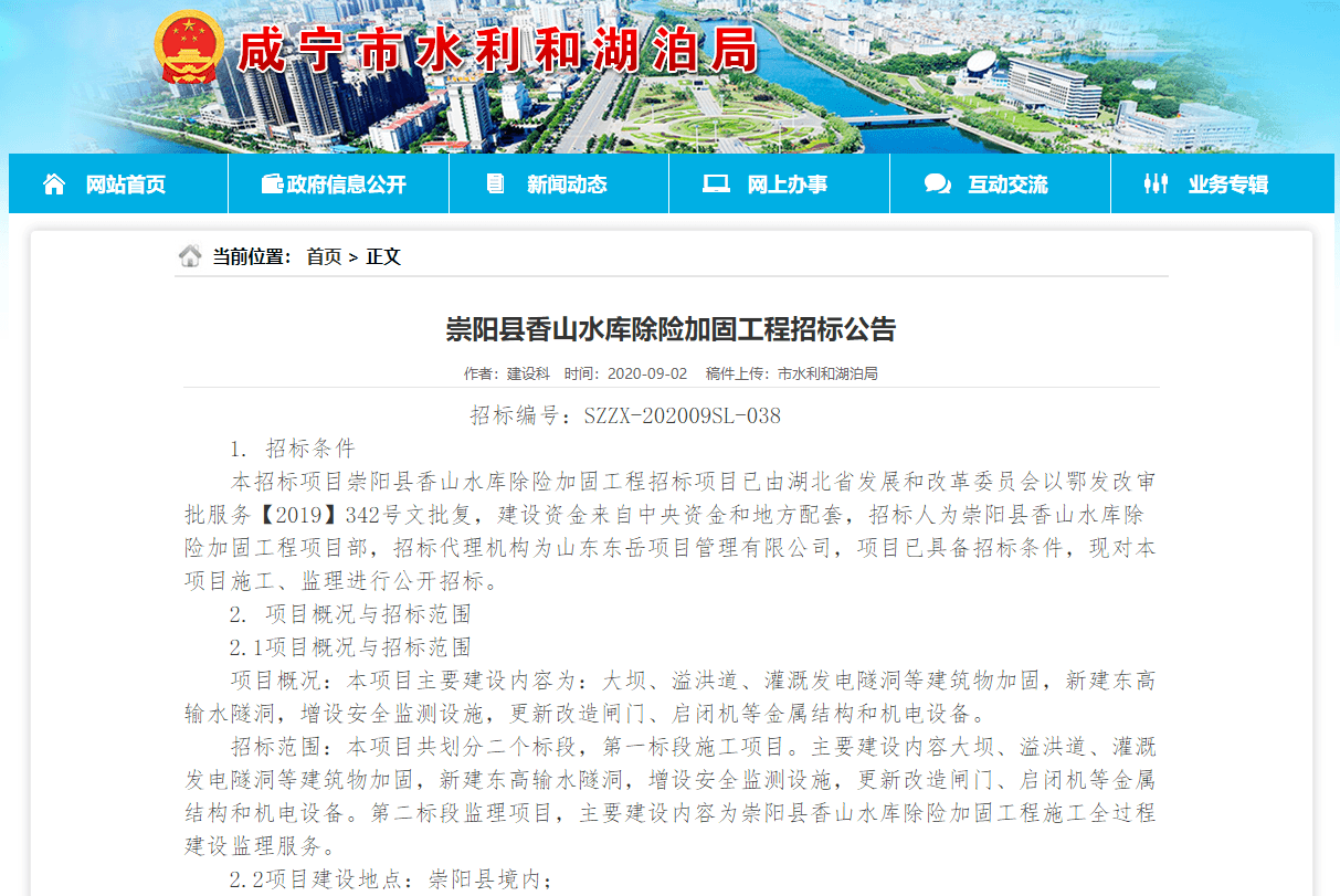 本招标项目崇阳县香山水库除险加固工程招标项目已由湖北省发展和改革委员会以鄂发改审批服务【2019】342号文批复,建设资金来自中央资金和地方配套,招标人为崇阳县香山水库除险加固工程项目部,招标代理机构为山东东岳项目管理有限公司,项目已具备招标条件,现对本项目施工、监理进行公开招标。