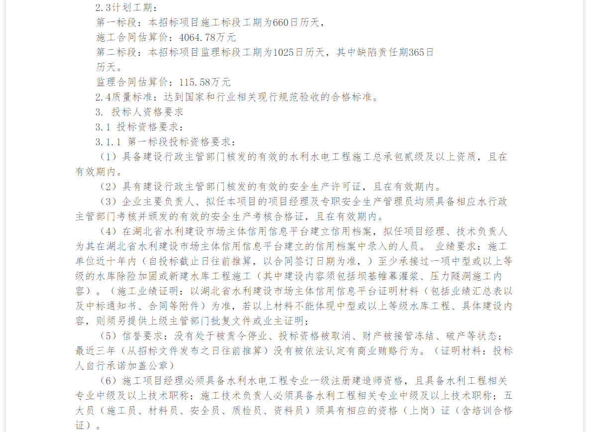 (4)在湖北省水利建设市场主体信用信息平台建立信用档案,拟任项目经理、技术负责人为其在湖北省水利建设市场主体信用信息平台建立的信用档案中录入的人员。 业绩要求:施工单位近十年内(自投标截止日往前推算,以合同签订日期为准,)至少承接过一项中型或以上等级的水库除险加固或新建水库工程施工(其中建设内容须包括坝基帷幕灌浆、压力隧洞施工内容)。(施工业绩证明:以湖北省水利建设市场主体信用信息平台证明材料(包括业绩汇总表以及中标通知书、合同等附件)为准,若以上材料不能体现中型或以上等级水库工程、具体建设内容,则须另提供上级主管部门批复文件或业主证明;