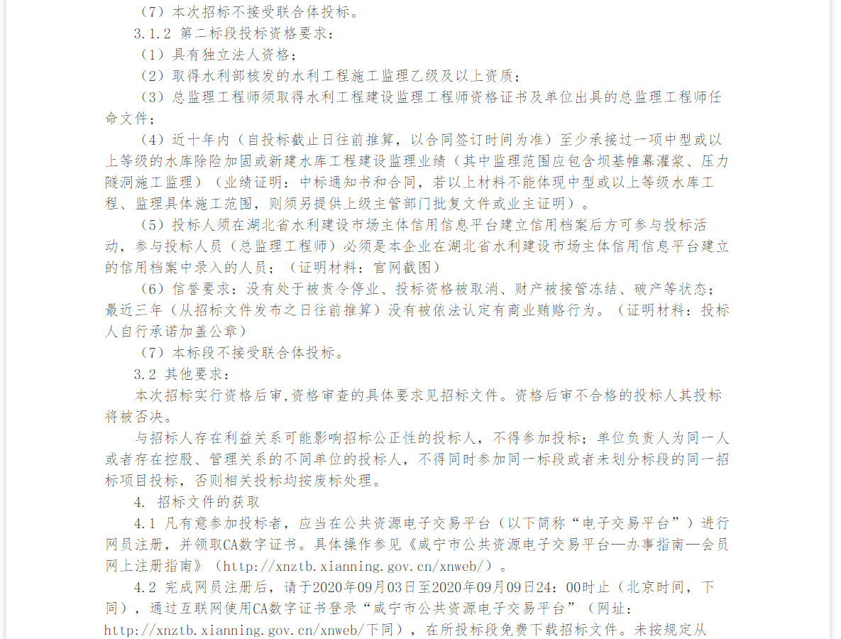 4.2 完成网员注册后,请于2020年09月03日至2020年09月09日24:00时止(北京时间,下同),通过互联网使用CA数字证书登录“咸宁市公共资源电子交易平台”(网址:http://xnztb.xianning.gov.cn/xnweb/下同),在所投标段免费下载招标文件。未按规定从“电子交易平台”下载招标文件的,其投标将被否决。