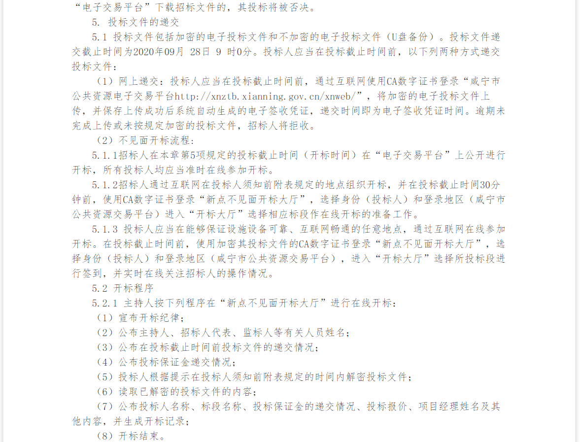 5.1 投标文件包括加密的电子投标文件和不加密的电子投标文件(U盘备份)。投标文件递交截止时间为2020年09月 28日 9 时0分。投标人应当在投标截止时间前,以下列两种方式递交投标文件: