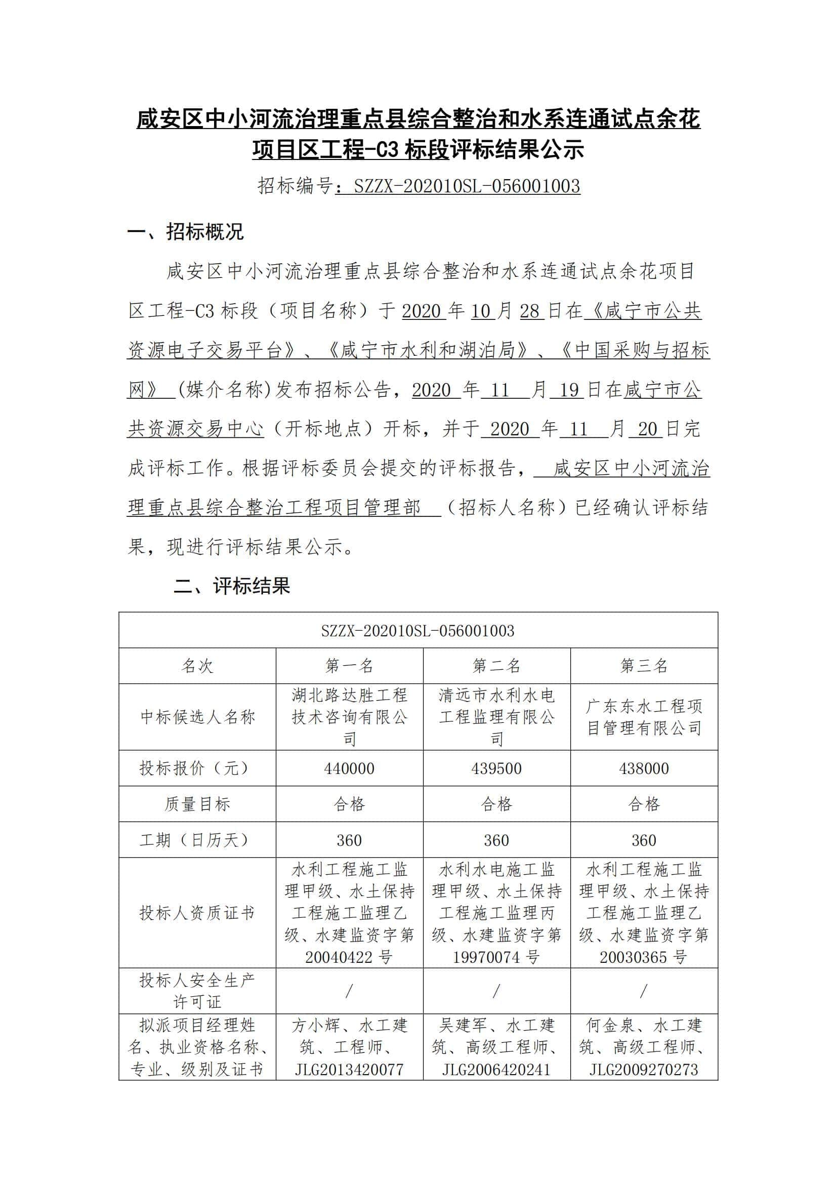 咸安区中小河流治理重点县综合整治和水系连通试点余花项目区工程-C3 标段评标结果公示