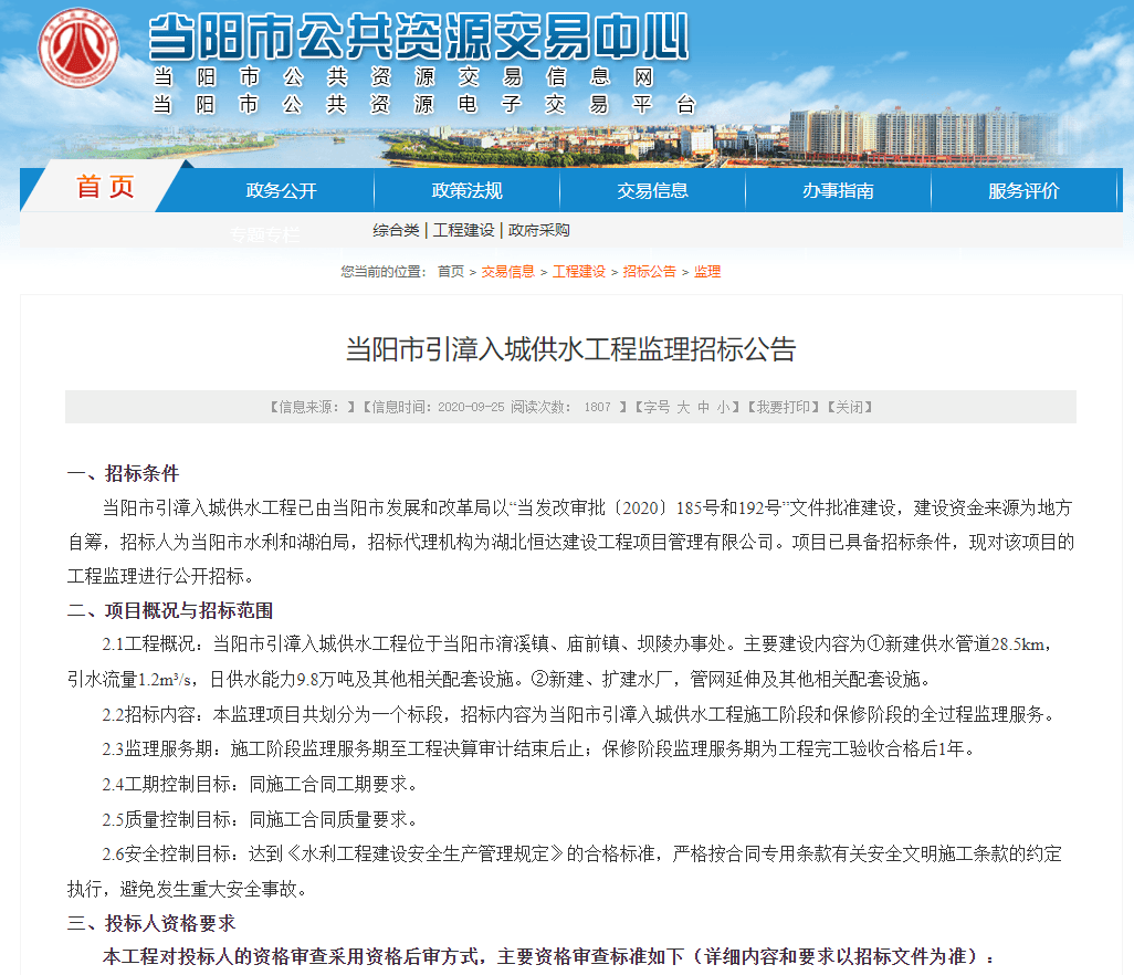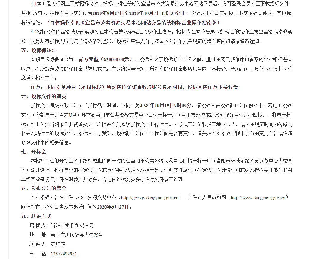 本次招标公告在当阳市公共资源交易中心(http://ggzyjy.dangyang.gov.cn)、当阳市人民政府网(http://www.dangyang.gov.cn)网上发布,招标公告发布起始时间为2020927
