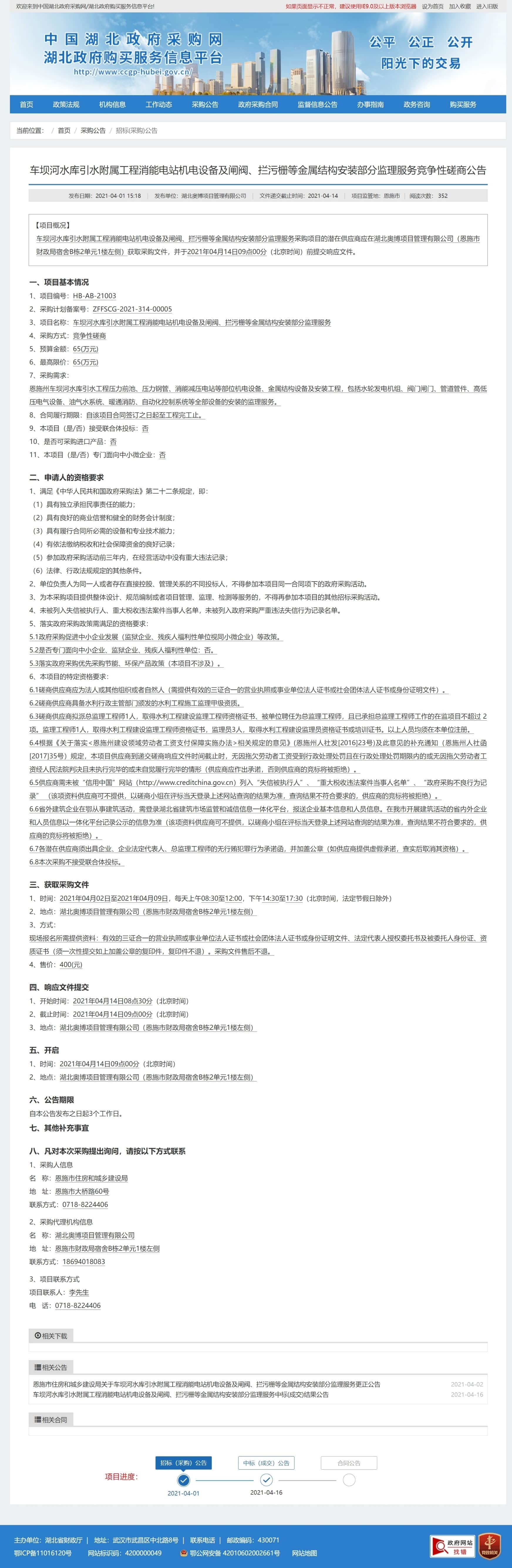 恩施州车坝河水库引水工程压力前池、压力钢管、消能减压电站等部位机电设备、金属结构设备及安装工程,包括水轮发电机组、阀门闸门、管道管件、高低压电气设备、油气水系统、暖通消防、自动化控制系统等全部设备的安装的监理服务。