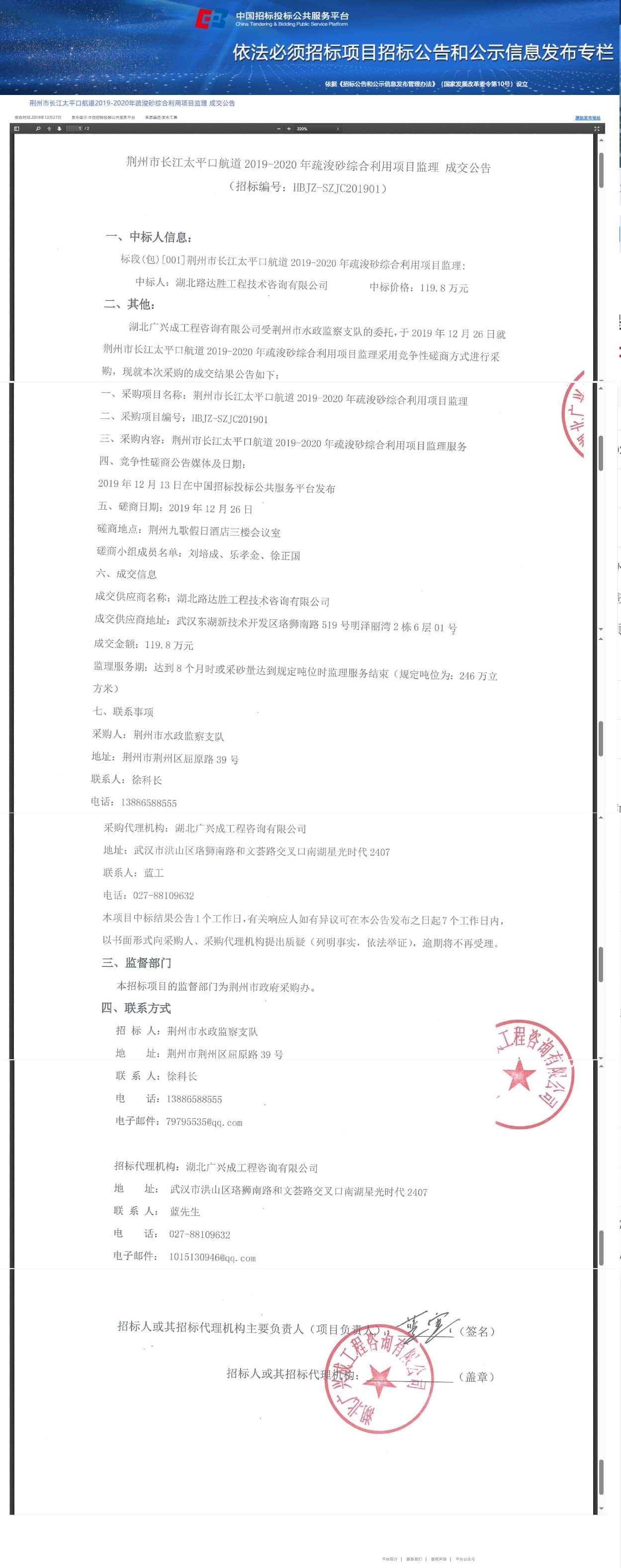 荆州市长江太平口航道2019-2020年疏浚砂综合利用项目监理成交公告