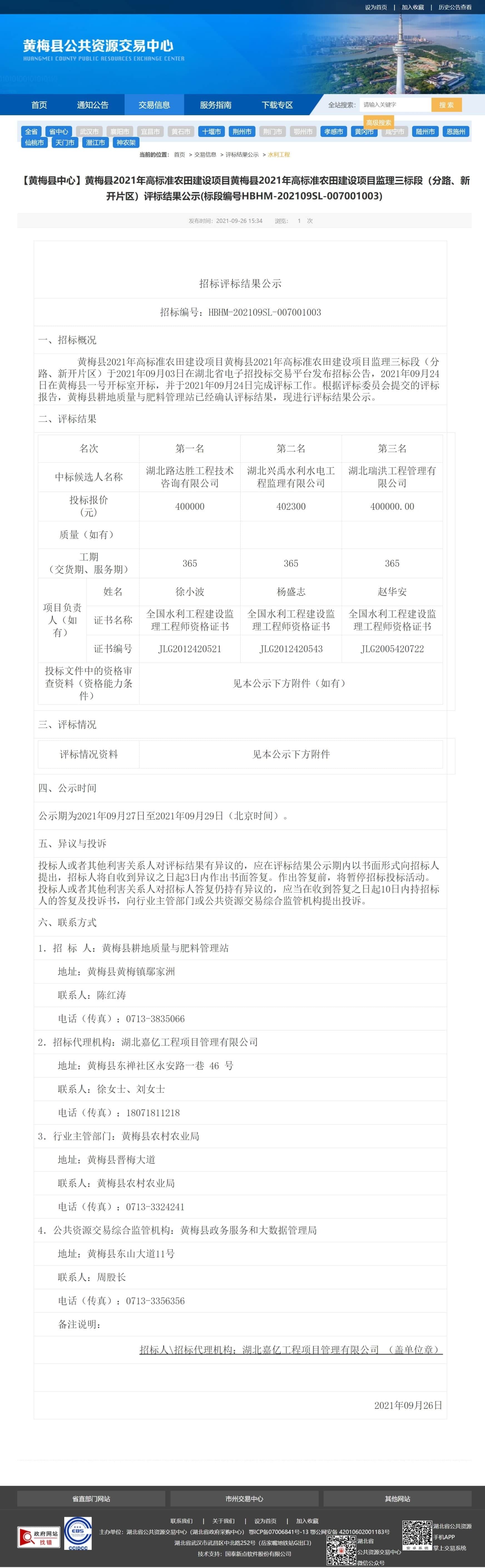 黄梅县2021年高标准农田建设项目黄梅县2021年高标准农田建设项目监理三标段(分路、新开片区)于2021年09月03日在湖北省电子招投标交易平台发布招标公告,2021年09月24日在黄梅县一号开标室开标,并于2021年09月24日完成评标工作。根据评标委员会提交的评标报告,黄梅县耕地质量与肥料管理站已经确认评标结果,现进行评标结果公示。