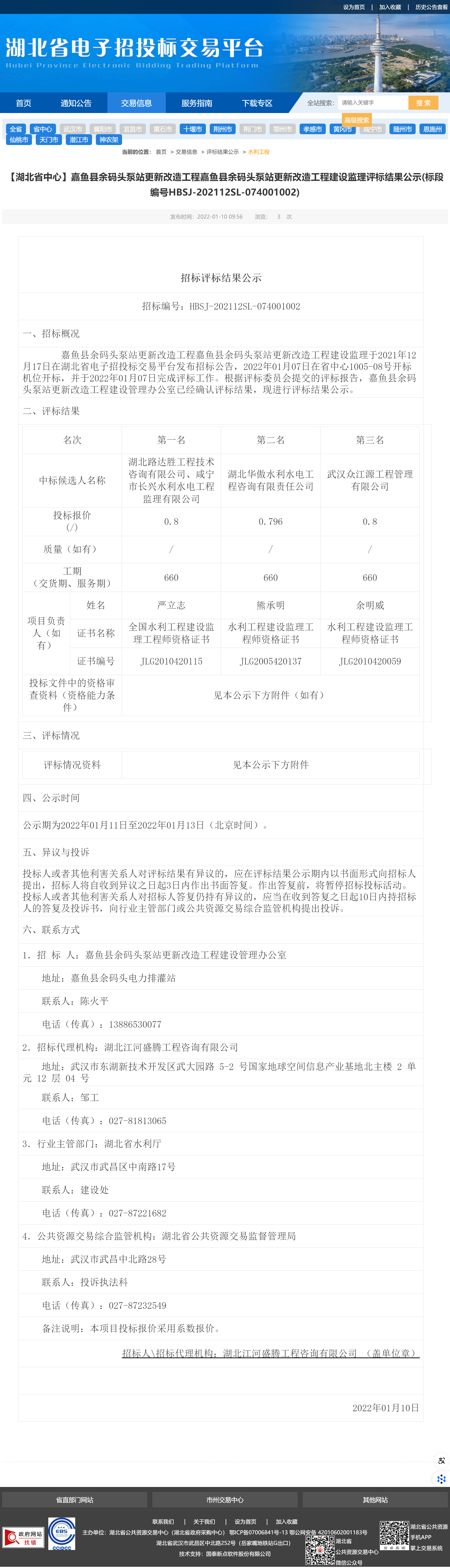 嘉鱼县余码头泵站更新改造工程建设监理评标结果公示