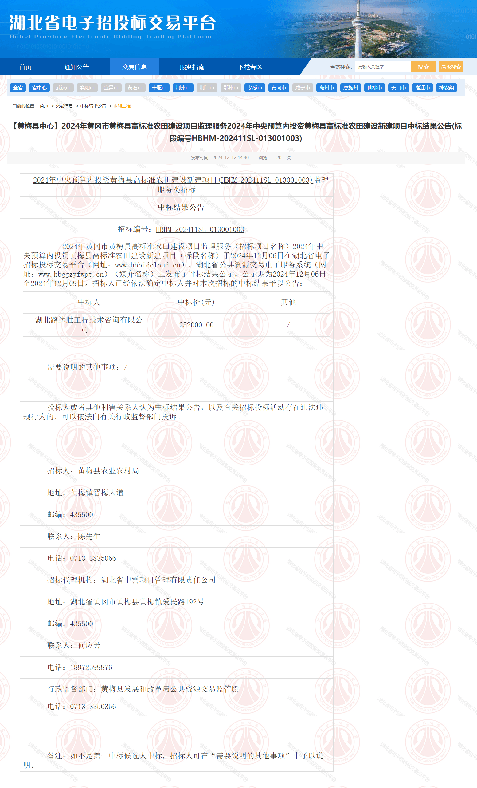 2024年黄冈市黄梅县高标准农田建设项目监理服务(招标项目名称)2024年中央预算内投资黄梅县高标准农田建设新建项目(标段名称)于2024年12月06日在湖北省电子招标投标交易平台(网址:www.hbbidcloud.cn)、湖北省公共资源交易电子服务系统(网址:www.hbggzyfwpt.cn)(媒介名称)上发布了评标结果公示,公示期为2024年12月06日至2024年12月09日。招标人已经依法确定中标人并对本次招标的中标结果予以公告: