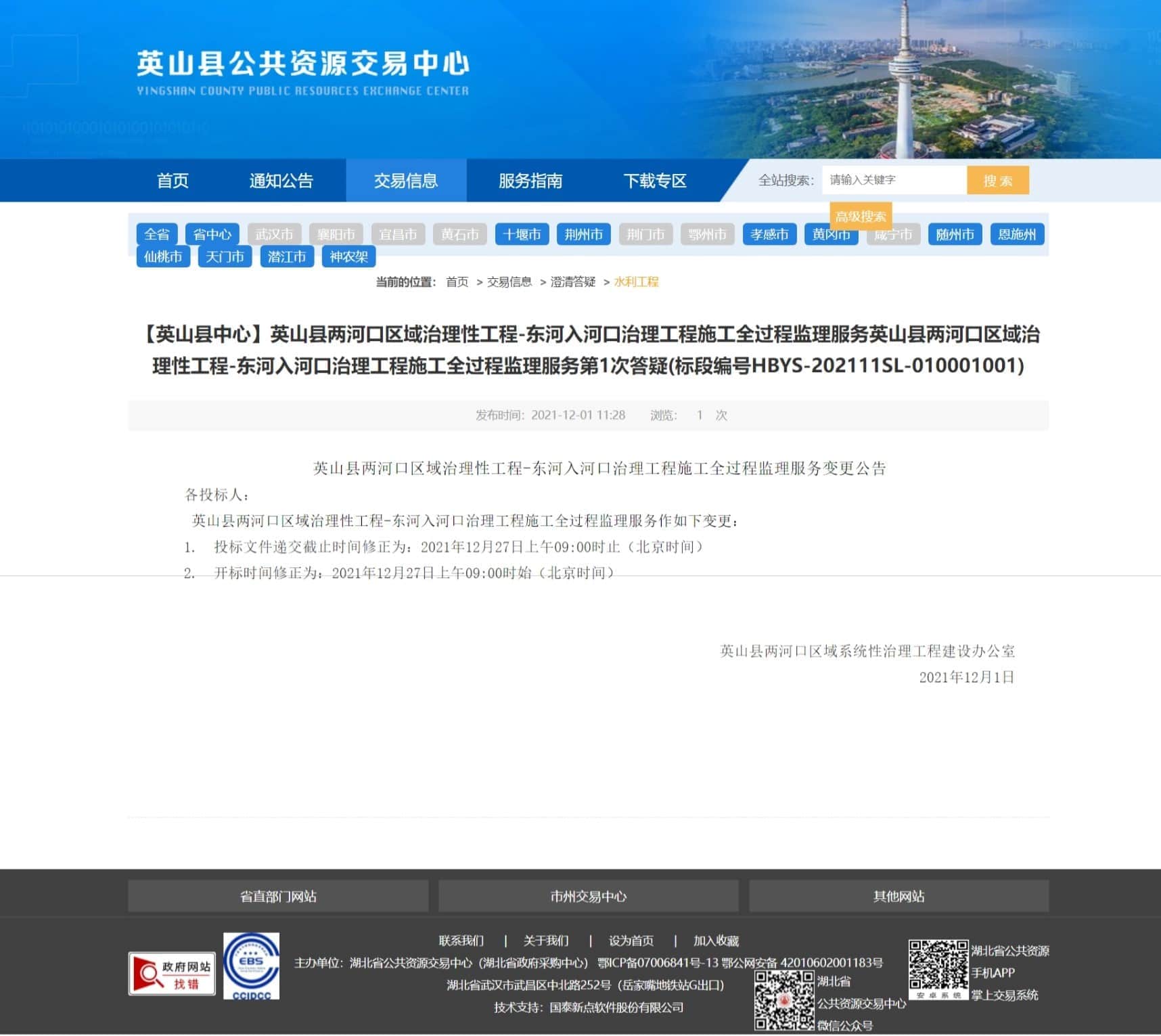 【英山县中心】英山县两河口区域治理性工程-东河入河口治理工程施工全过程监理服务英山县两河口区域治理性工程-东河入河口治理工程施工全过程监理服务第1次答疑(标段编号HBYS-202111SL-010001001)