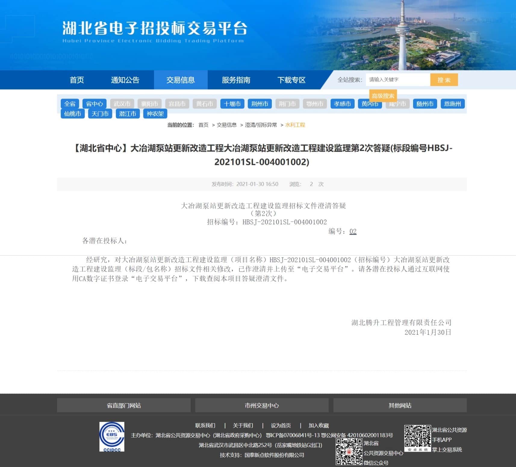 【湖北省中心】大冶湖泵站更新改造工程大冶湖泵站更新改造工程建设监理第2次答疑(标段编号HBSJ-202101SL-004001002)