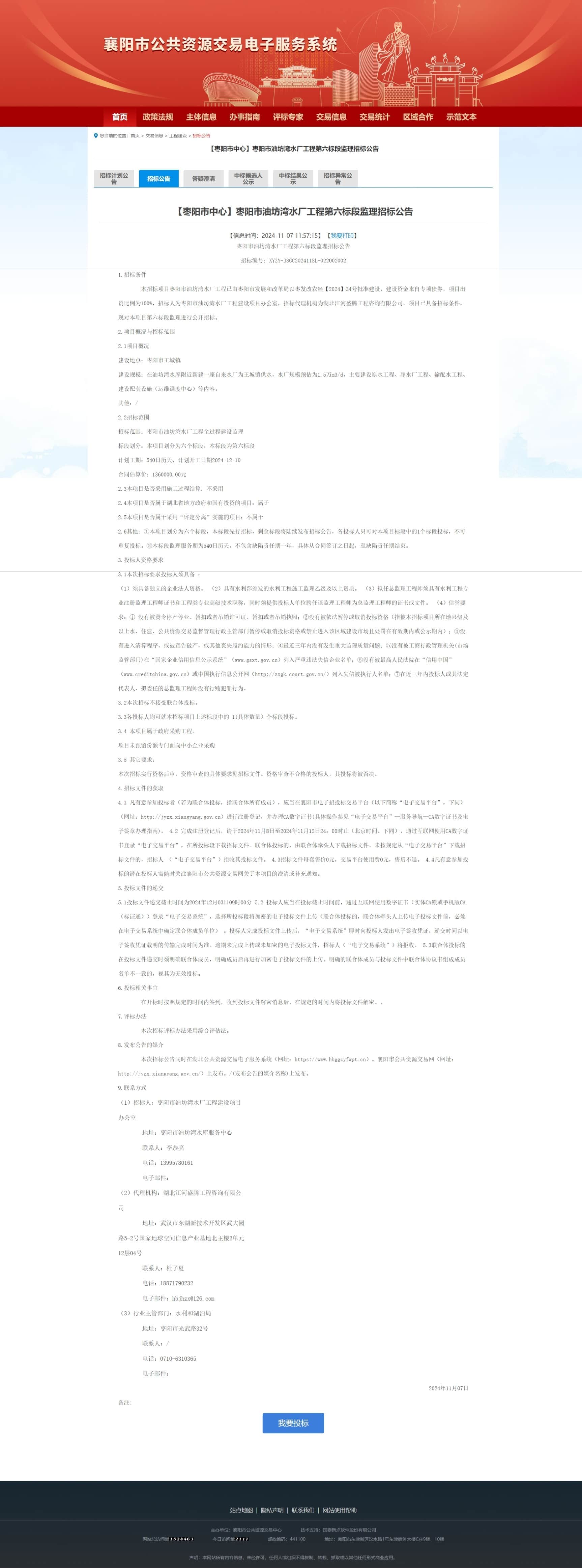 【枣阳市中心】枣阳市油坊湾水厂工程第六标段监理招标公告
