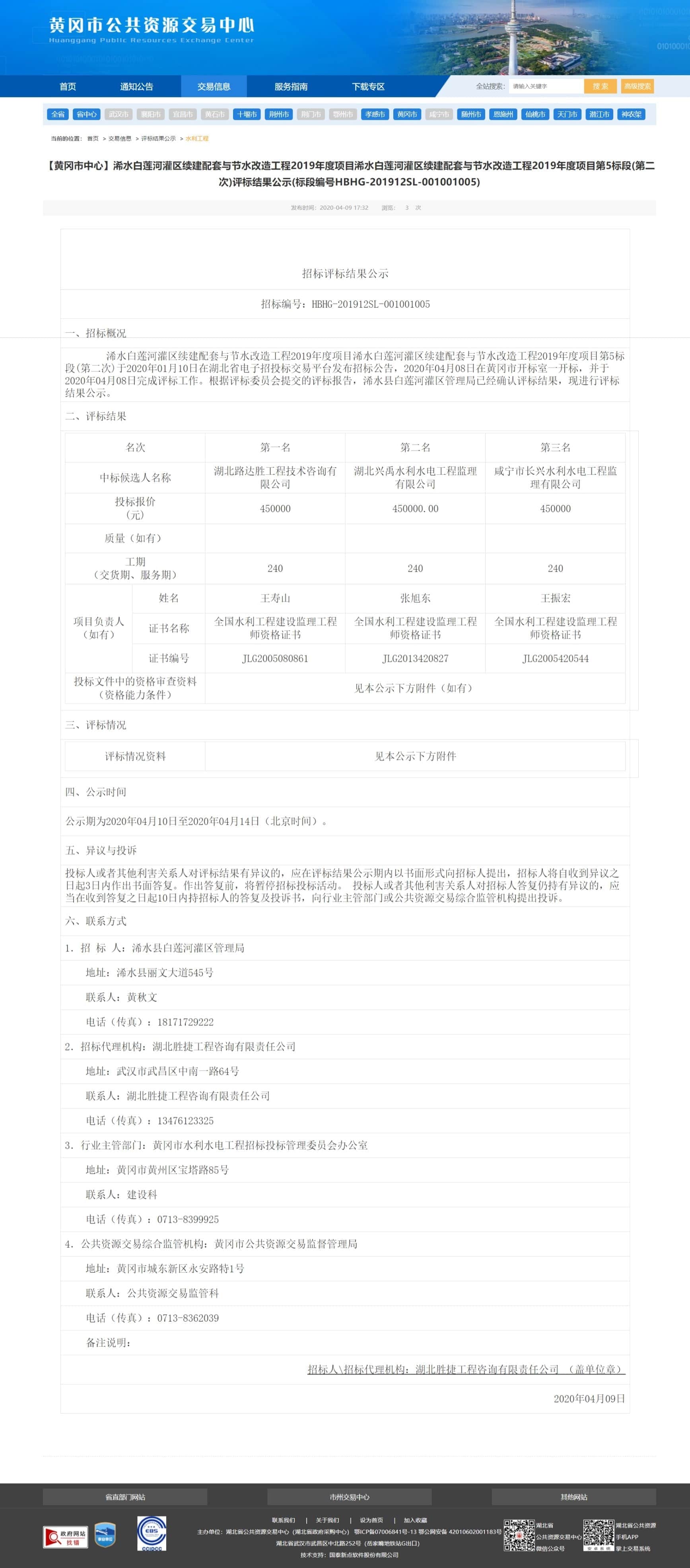 【黄冈市中心】浠水白莲河灌区续建配套与节水改造工程2019年度项目浠水白莲河灌区续建配套与节水改造工程2019年度项目第5标段(第二次)评标结果公示(标段编号HBHG-201912SL-001001005)