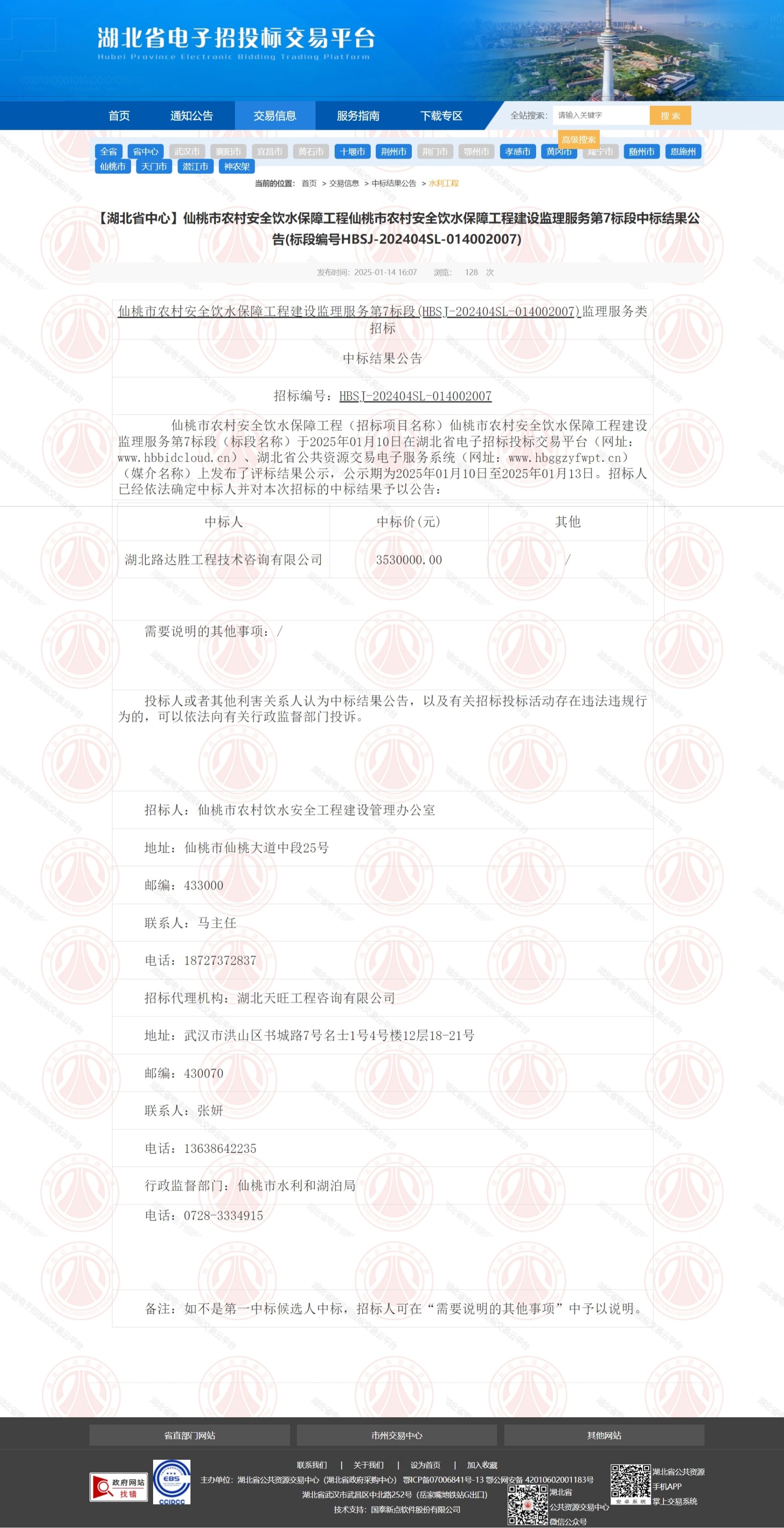 【湖北省中心】仙桃市农村安全饮水保障工程仙桃市农村安全饮水保障工程建设监理服务第7标段中标结果公告(标段编号HBSJ-202404SL-014002007)