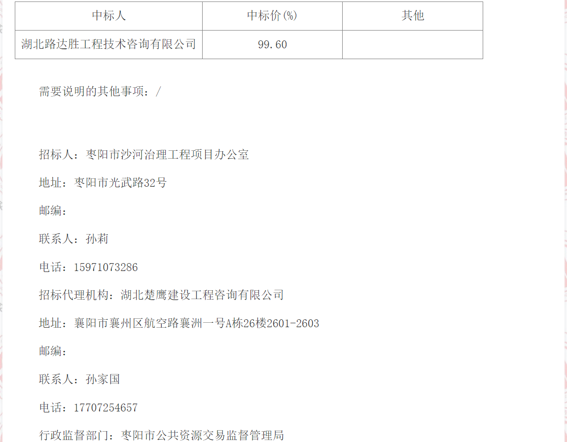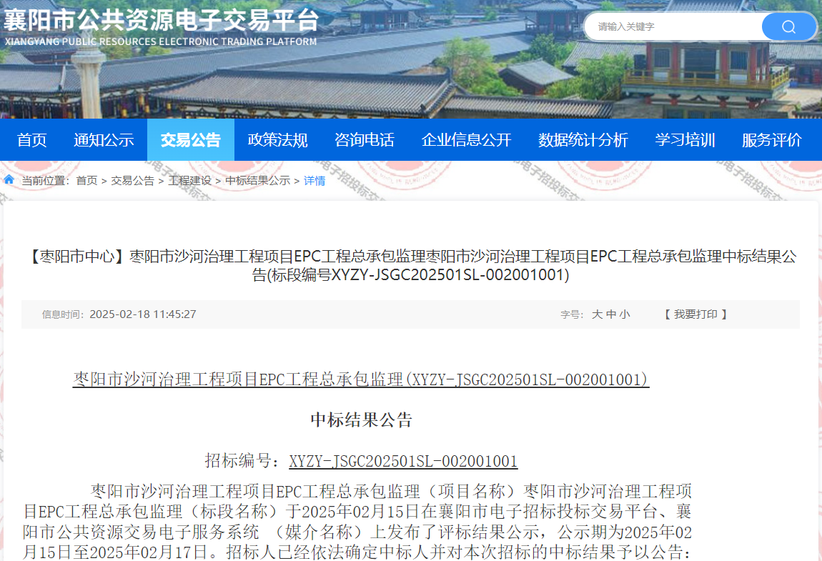枣阳市沙河治理工程项目EPC工程总承包监理(项目名称)枣阳市沙河治理工程项目EPC工程总承包监理(标段名称)于2025年02月15日在襄阳市电子招标投标交易平台、襄阳市公共资源交易电子服务系统 (媒介名称)上发布了评标结果公示,公示期为2025年02月15日至2025年02月17日。招标人已经依法确定中标人并对本次招标的中标结果予以公告: