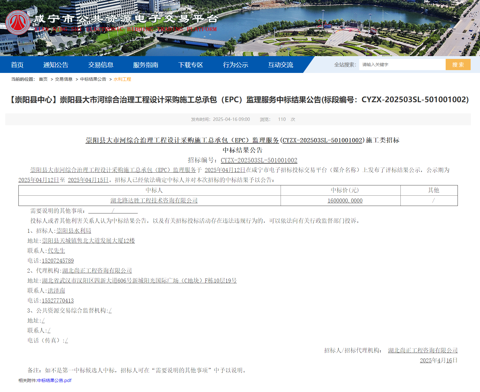 崇阳县大市河综合治理工程设计采购施工总承包(EPC)监理服务于 2025年04月12日在咸宁市电子招标投标交易平台(媒介名称)上发布了评标结果公示,公示期为 2025年04月12日至 2025年04月15日。招标人已经依法确定中标人并对本次招标的中标结果予以公告: