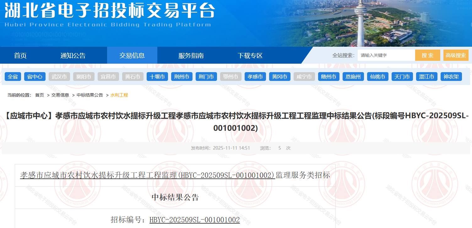 孝感市应城市农村饮水提标升级工程(招标项目名称)孝感市应城市农村饮水提标升级工程工程监理(标段名称)于2025年11月07日在湖北省电子招标投标交易平台(网址:www.hbbidcloud.cn)、湖北省公共资源交易电子服务系统(网址:www.hbggzyfwpt.cn)(媒介名称)上发布了评标结果公示,公示期为2025年11月07日至2025年11月10日。招标人已经依法确定中标人并对本次招标的中标结果予以公告: