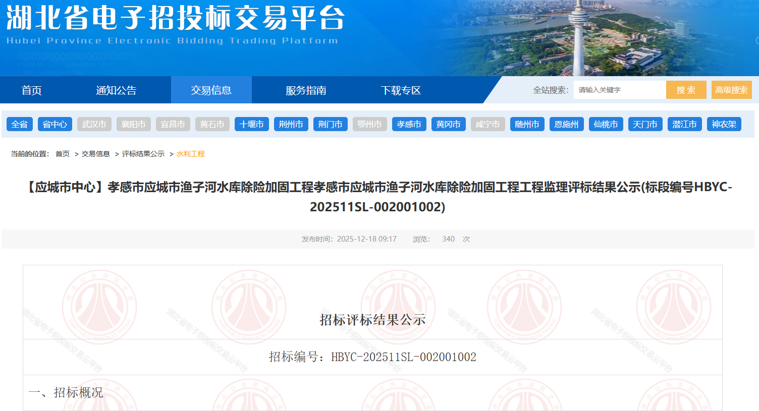 孝感市应城市渔子河水库除险加固工程工程监理于2025年11月11日在湖北省电子招投标交易平台发布招标公告,2025年12月15日在应城506开标室开标,并于2025年12月15日完成评标工作。 根据评标委员会提交的评标报告,应城市水利和湖泊局已经确认评标结果,现进行评标结果公示。