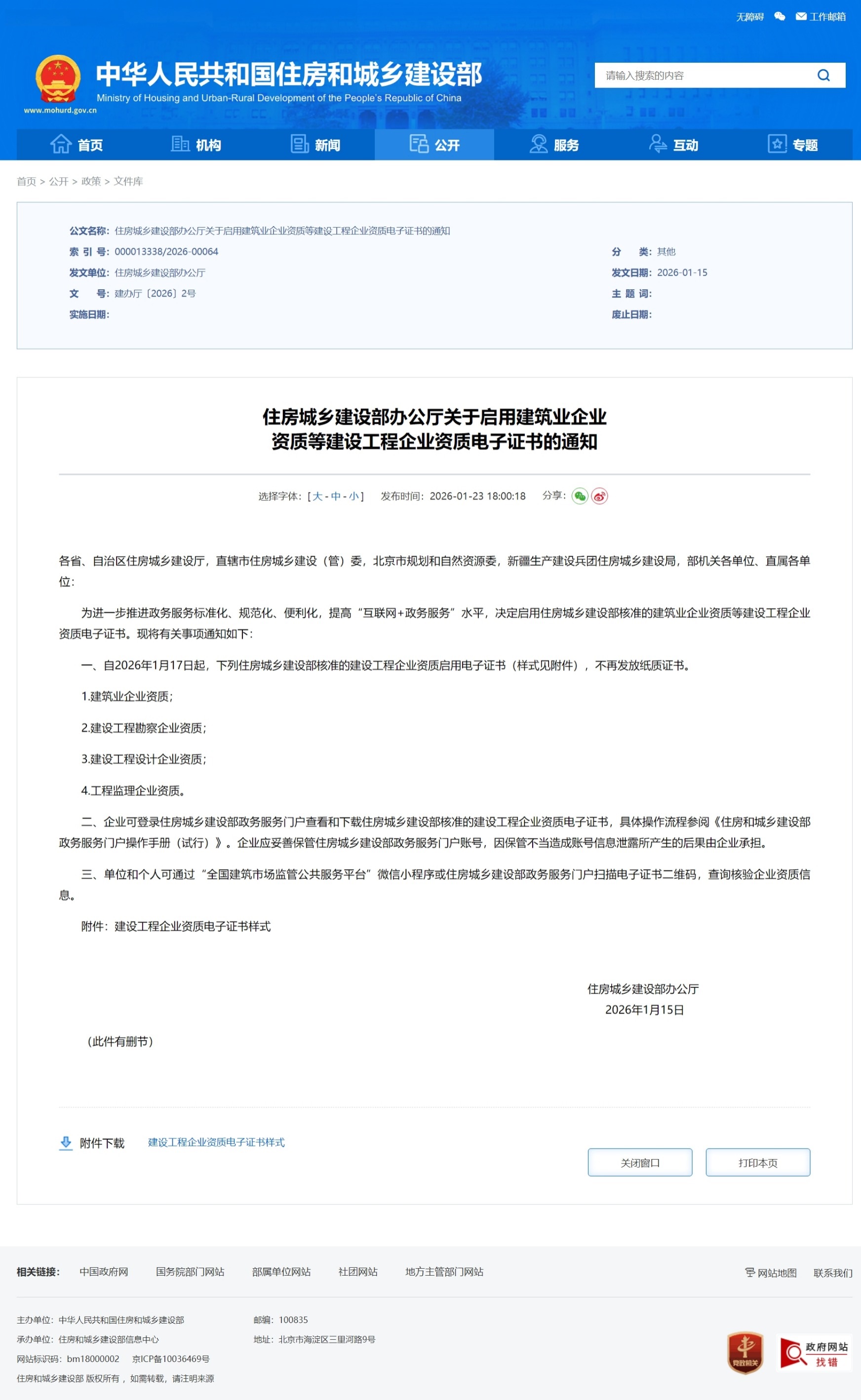 一、自2026年1月17日起,下列住房城乡建设部核准的建设工程企业资质启用电子证书(样式见附件),不再发放纸质证书。