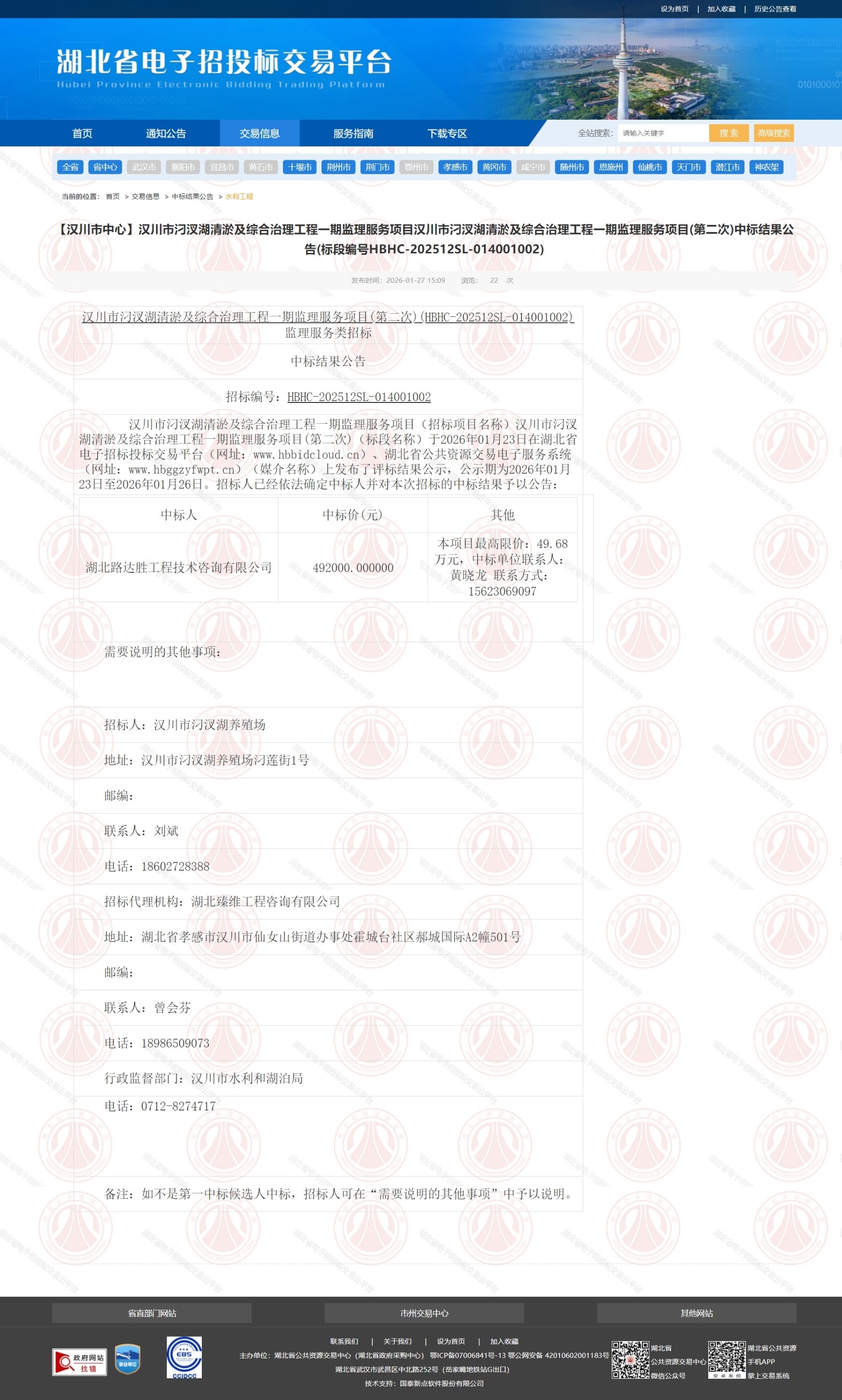 汉川市汈汊湖清淤及综合治理工程一期监理服务项目(招标项目名称)汉川市汈汊湖清淤及综合治理工程一期监理服务项目(第二次)(标段名称)于2026年01月23日在湖北省电子招标投标交易平台(网址:www.hbbidcloud.cn)、湖北省公共资源交易电子服务系统(网址:www.hbggzyfwpt.cn)(媒介名称)上发布了评标结果公示,公示期为2026年01月23日至2026年01月26日。招标人已经依法确定中标人并对本次招标的中标结果予以公告: