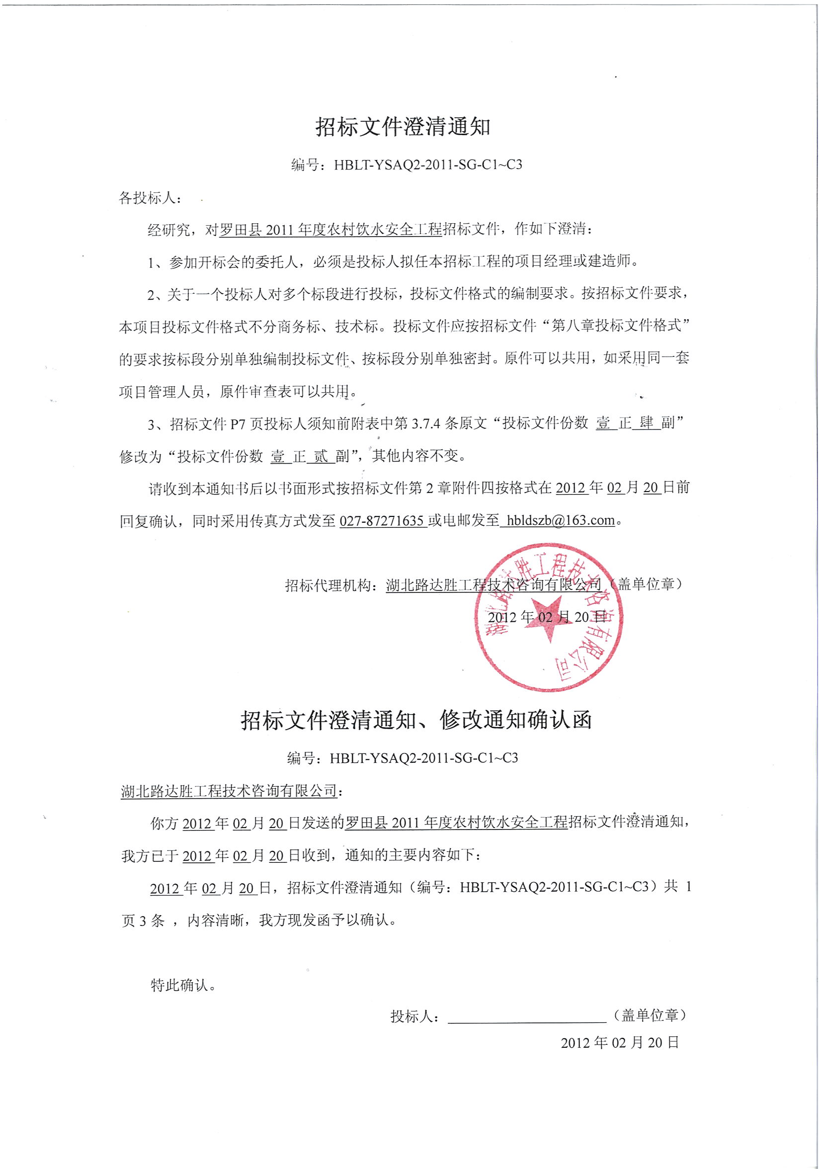罗田县2011年度农村饮水安全工程招标文件澄清通知