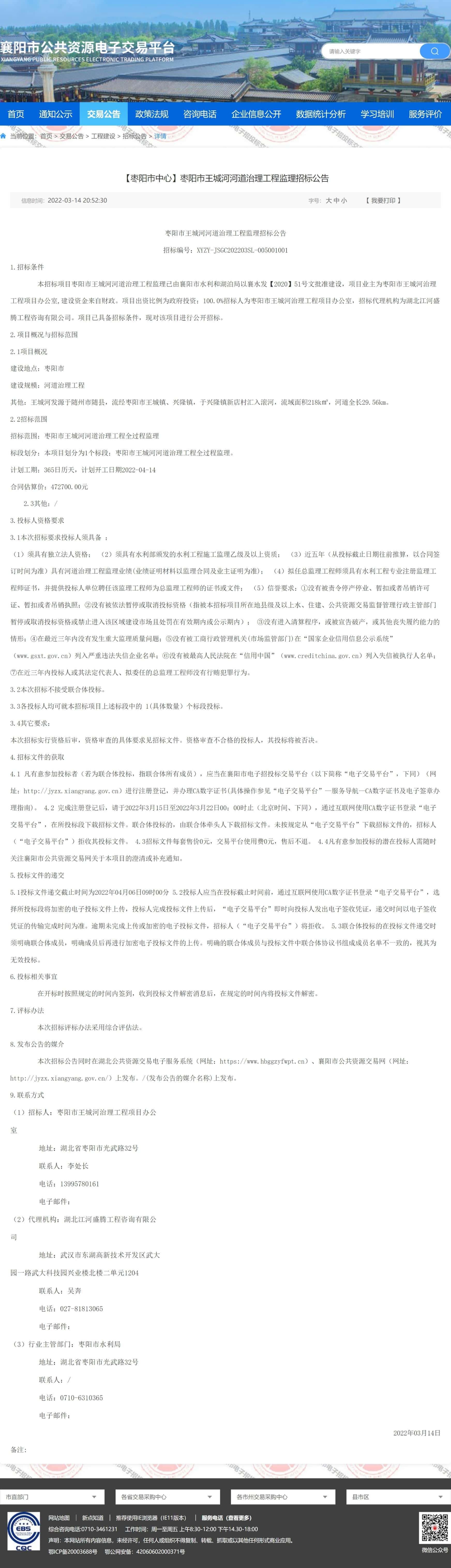 | 招标范围:枣阳市王城河河道治理工程全过程监理 标段划分:本项目划分为1个标段:枣阳市王城河河道治理工程全过程监理。 计划工期:365日历天,计划开工日期2022-04-14 合同估算价:472700.00元 |