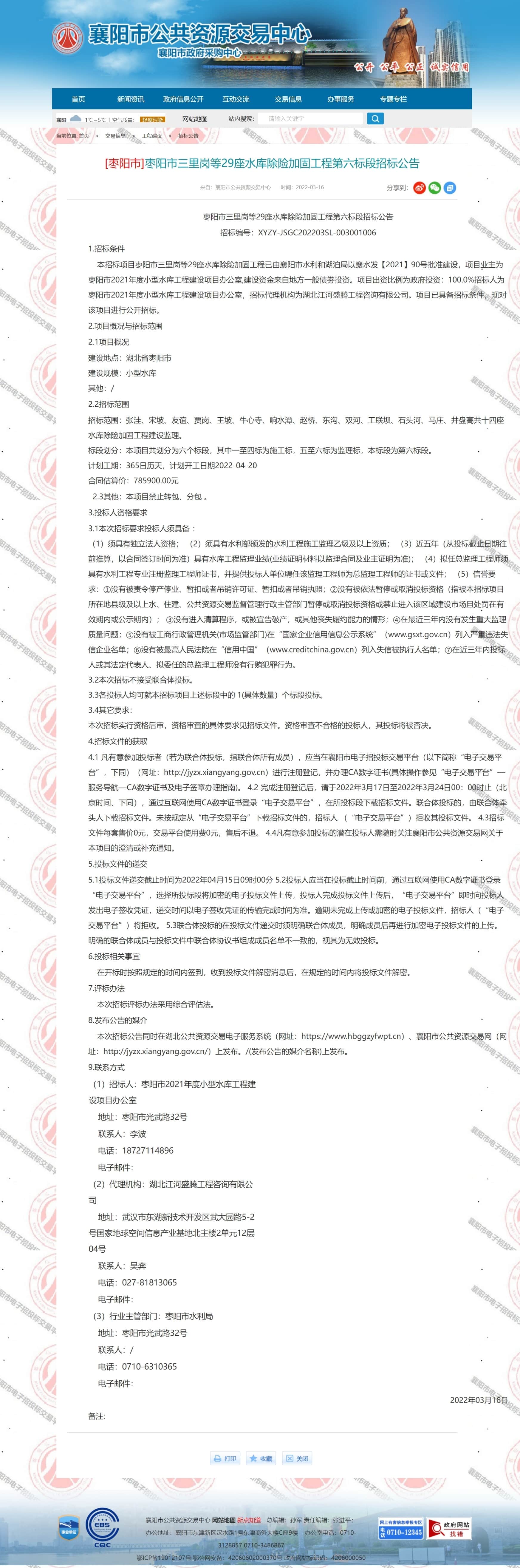 枣阳市三里岗等29座水库除险加固工程第六标段招标公告