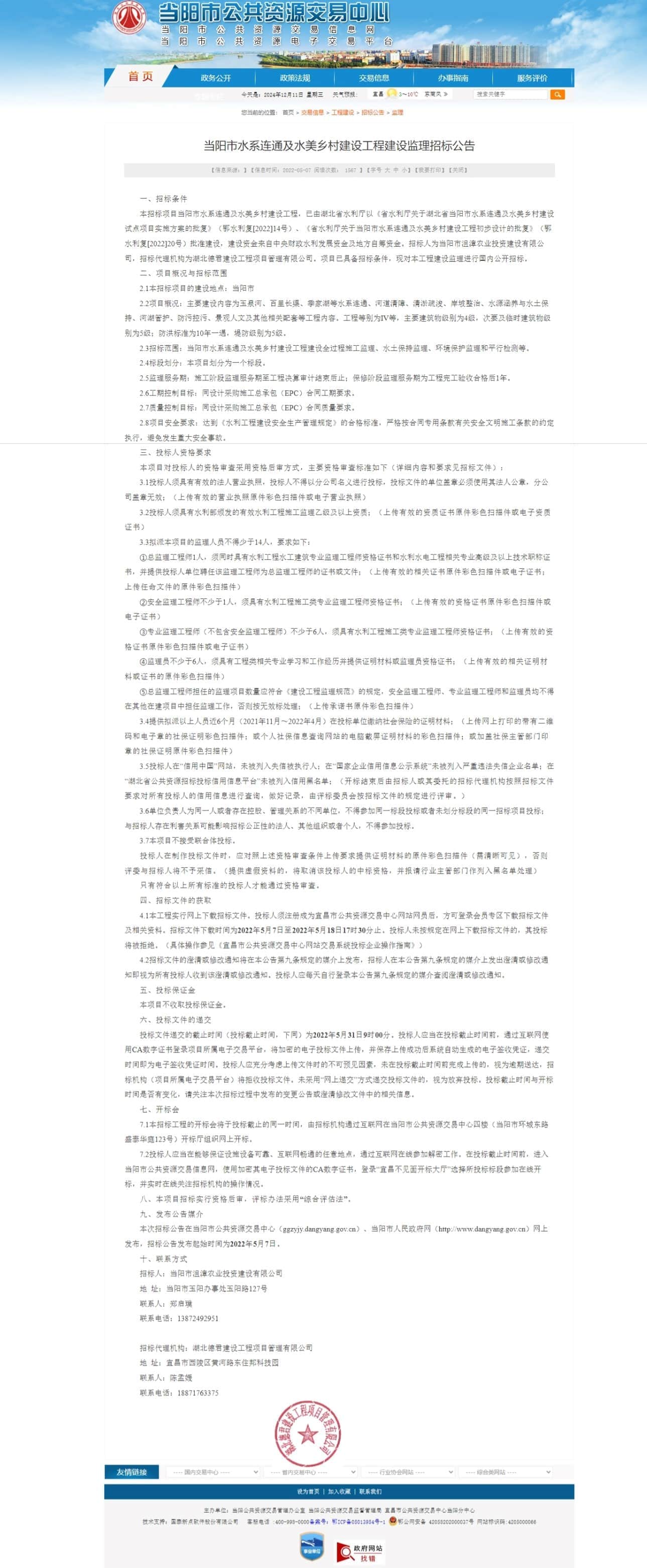 本次招标公告在当阳市公共资源交易中心(ggzyjy.dangyang.gov.cn)、当阳市人民政府网(http://www.dangyang.gov.cn)网上发布,招标公告发布起始时间为2022年5月7日。