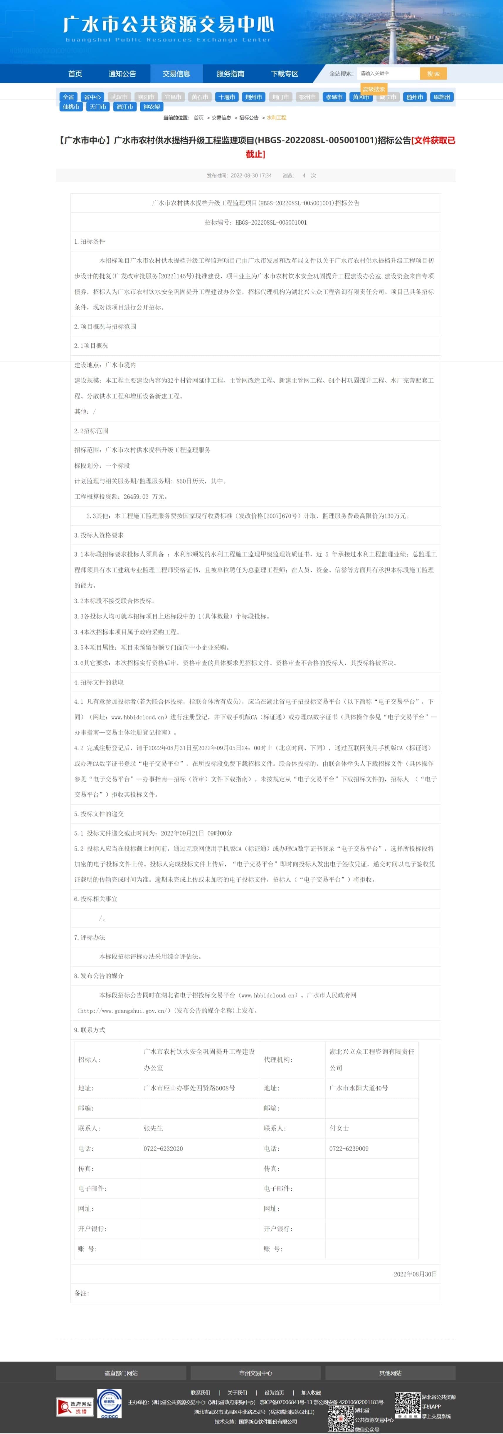 广水市农村供水提档升级工程监理项目(HBGS-202208SL-005001001)招标公告