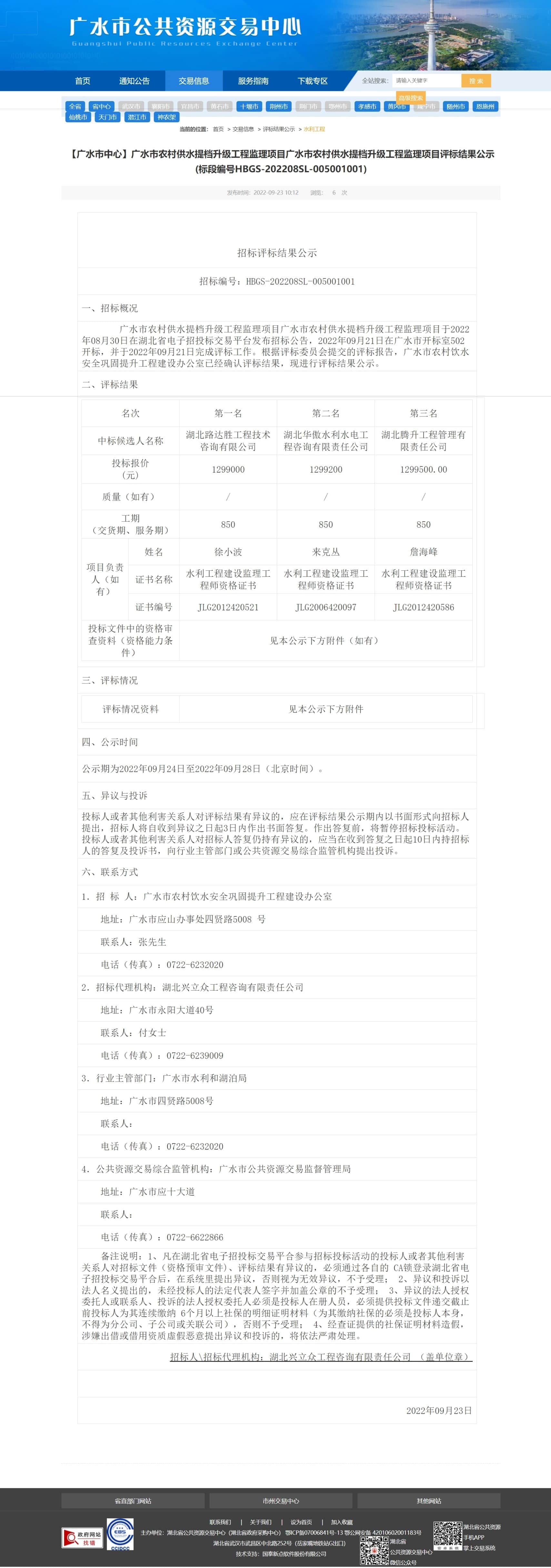 【广水市中心】广水市农村供水提档升级工程监理项目广水市农村供水提档升级工程监理项目评标结果公示(标段编号HBGS-202208SL-005001001)